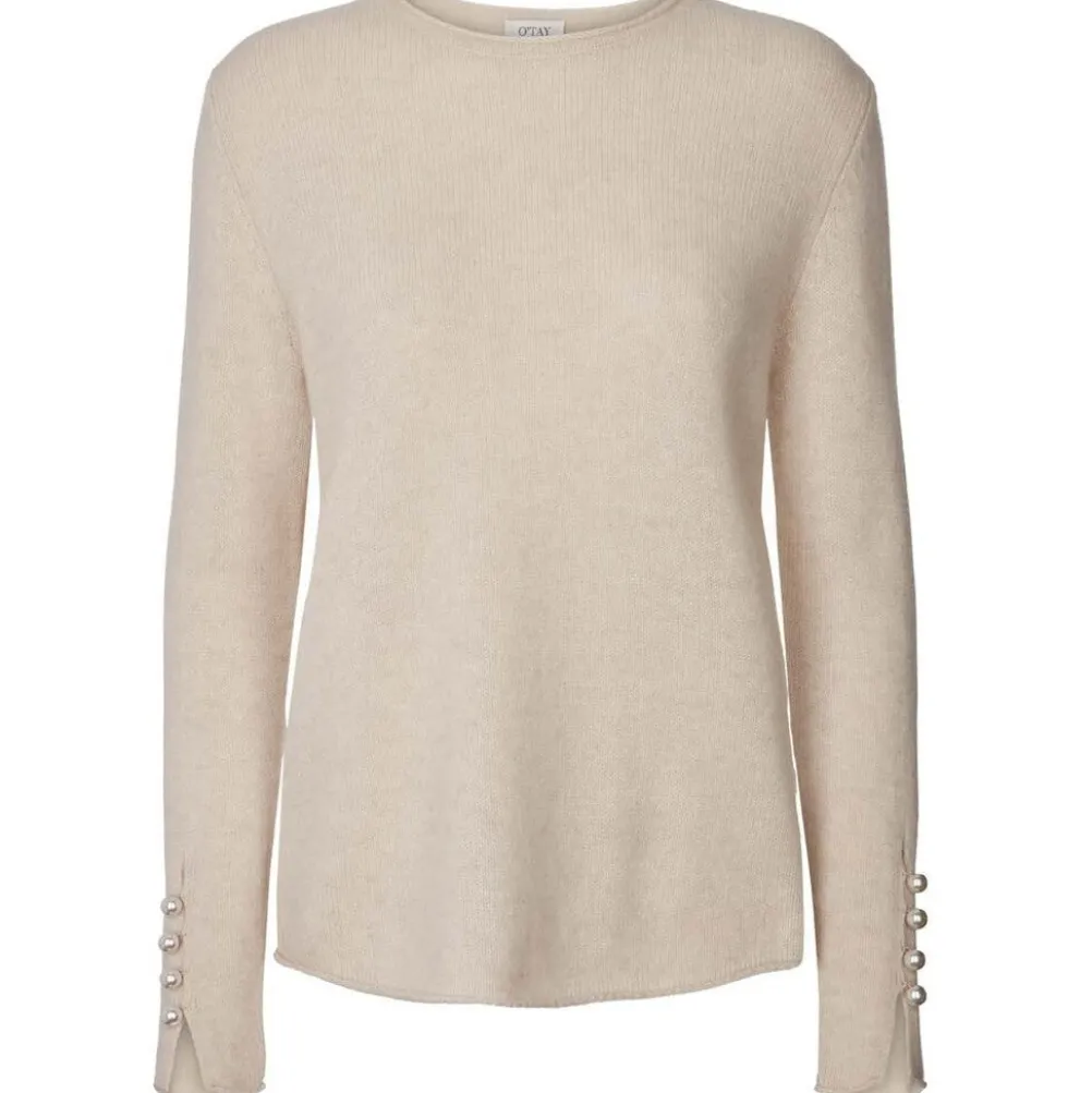 Lækker og elegant bestseller cashmere strik fra O’tay med flotte perleknapper ved ærmerne. Strikken er lavet af det blødeste cashmere uld, som er meget komfortabelt.
