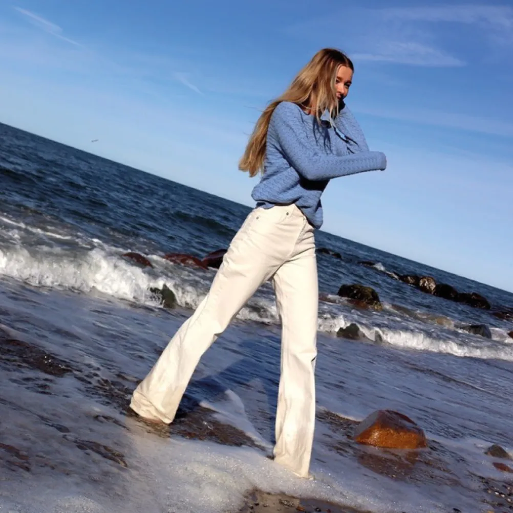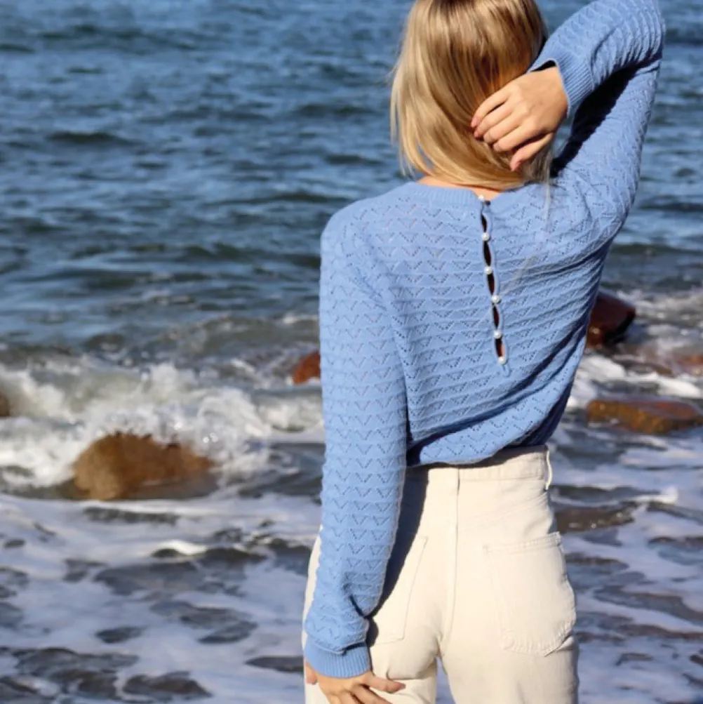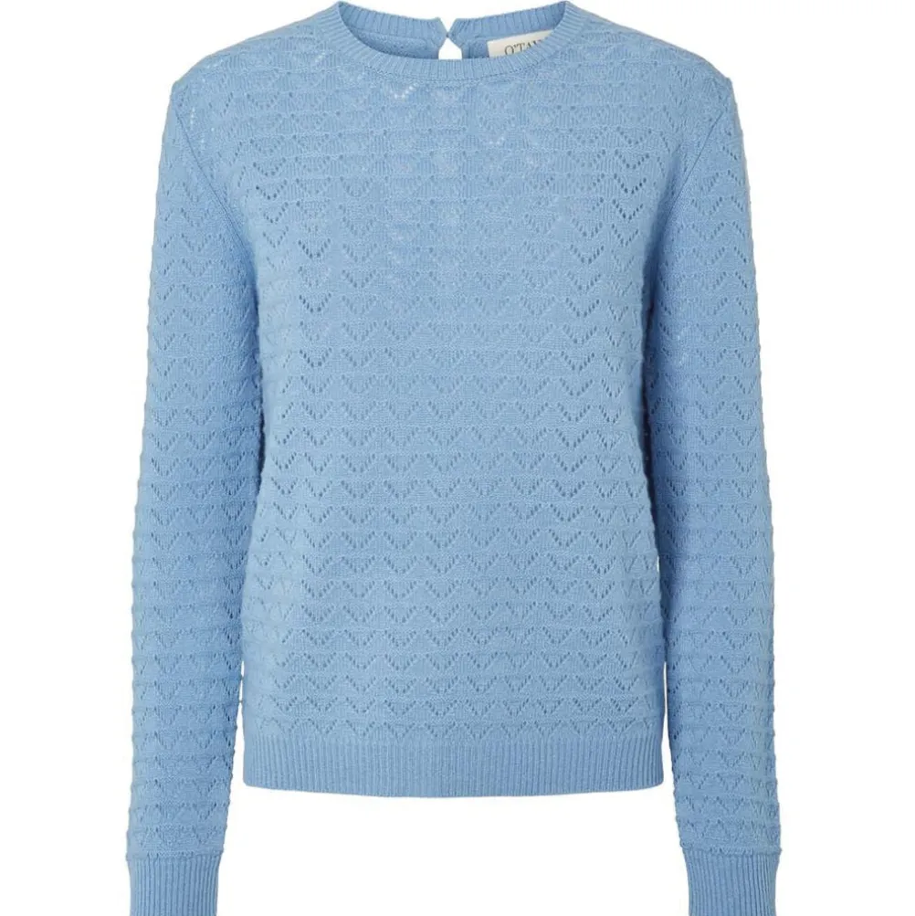 Lækker sweater/bluse i cashmereblanding fra O’tay med rund hals, smukt strikket mønster og flotte perleknapper langs ryggen. Almindelig i størrelsen.