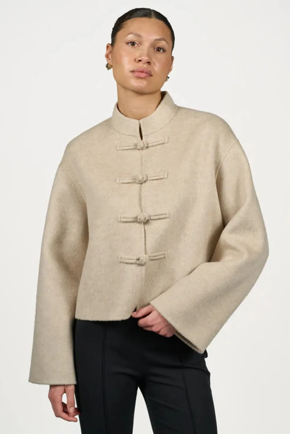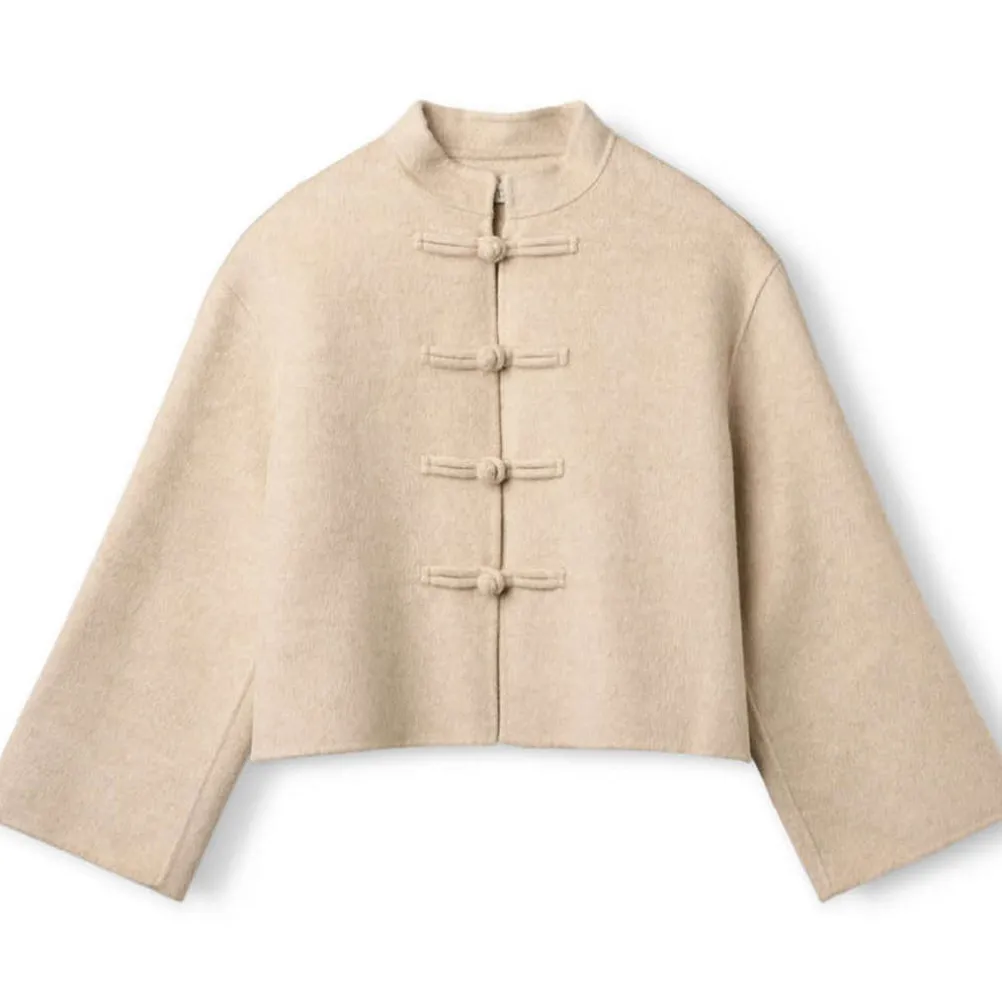 Elegant kort uldjakke fra O’tay med fine detaljer! Lavet i en blød uldblanding og lukkes med fine stropper foran. Klassisk og tidsløs.