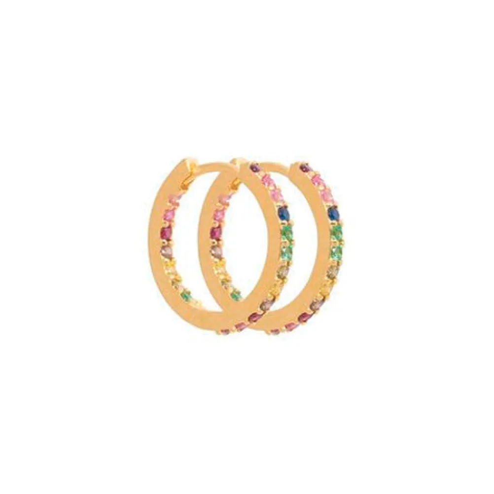 Smukke creoler fra Pico Copenhagen i forgyldt sterlingsølv med multifarvede krystaller på forsiden af øreringen og indeni, hvilket giver en smuk effekt, når du har dem på.