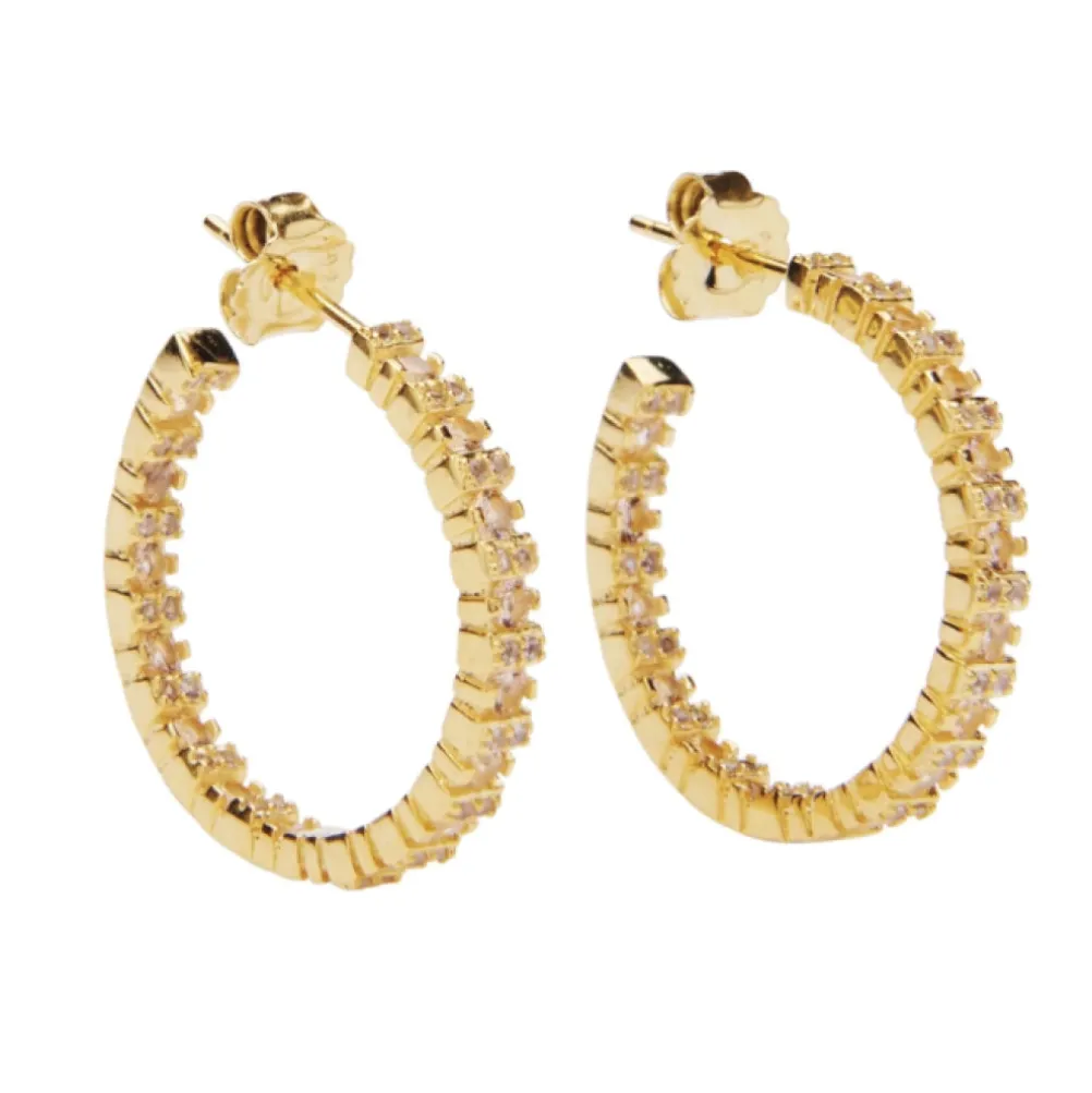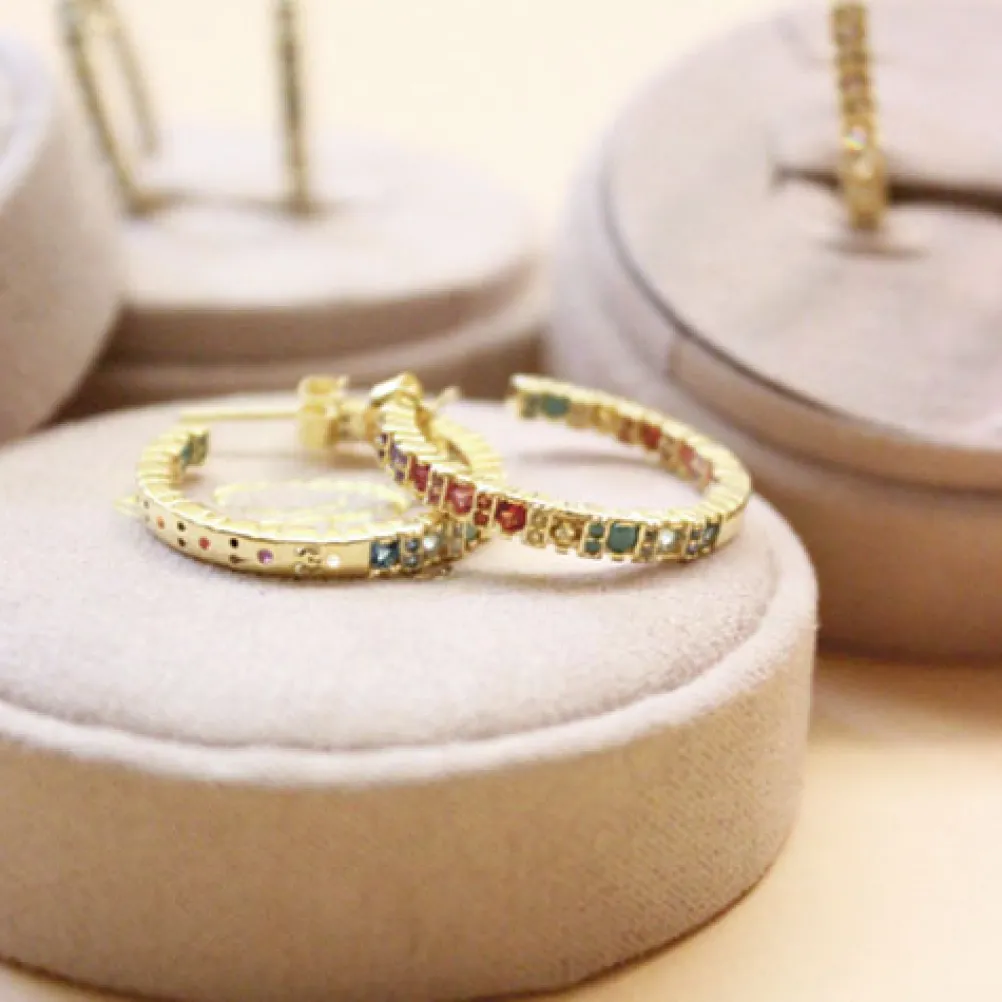 Store smukke hoops fra Pico Copenhagen med flotte pudder farvede krystaller både foran og inde i øreringen hvilket giver en smuk effekt når du har dem på. De smukke hoops er i forgyldt sterlingsølv.