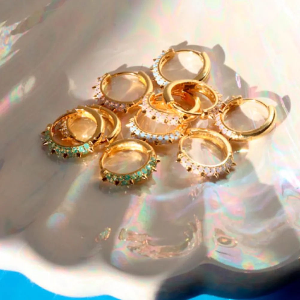 Super cool og samtidig rigtig fin Suede Hoops fra Pico Copenhagen. Øreringen er rund besat af fine små klare nano krystaller og pigge på det forreste stykke af ørerigen.