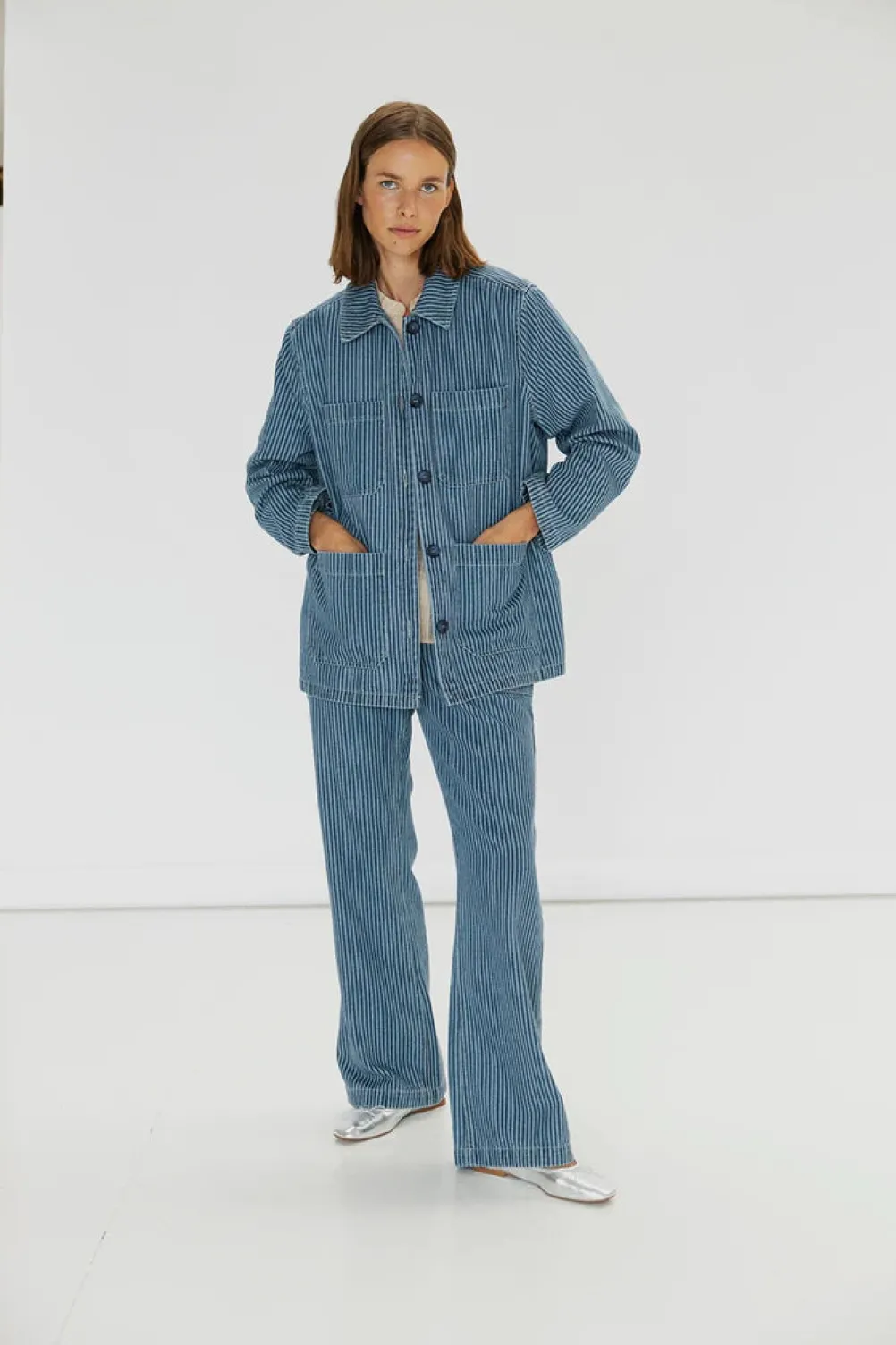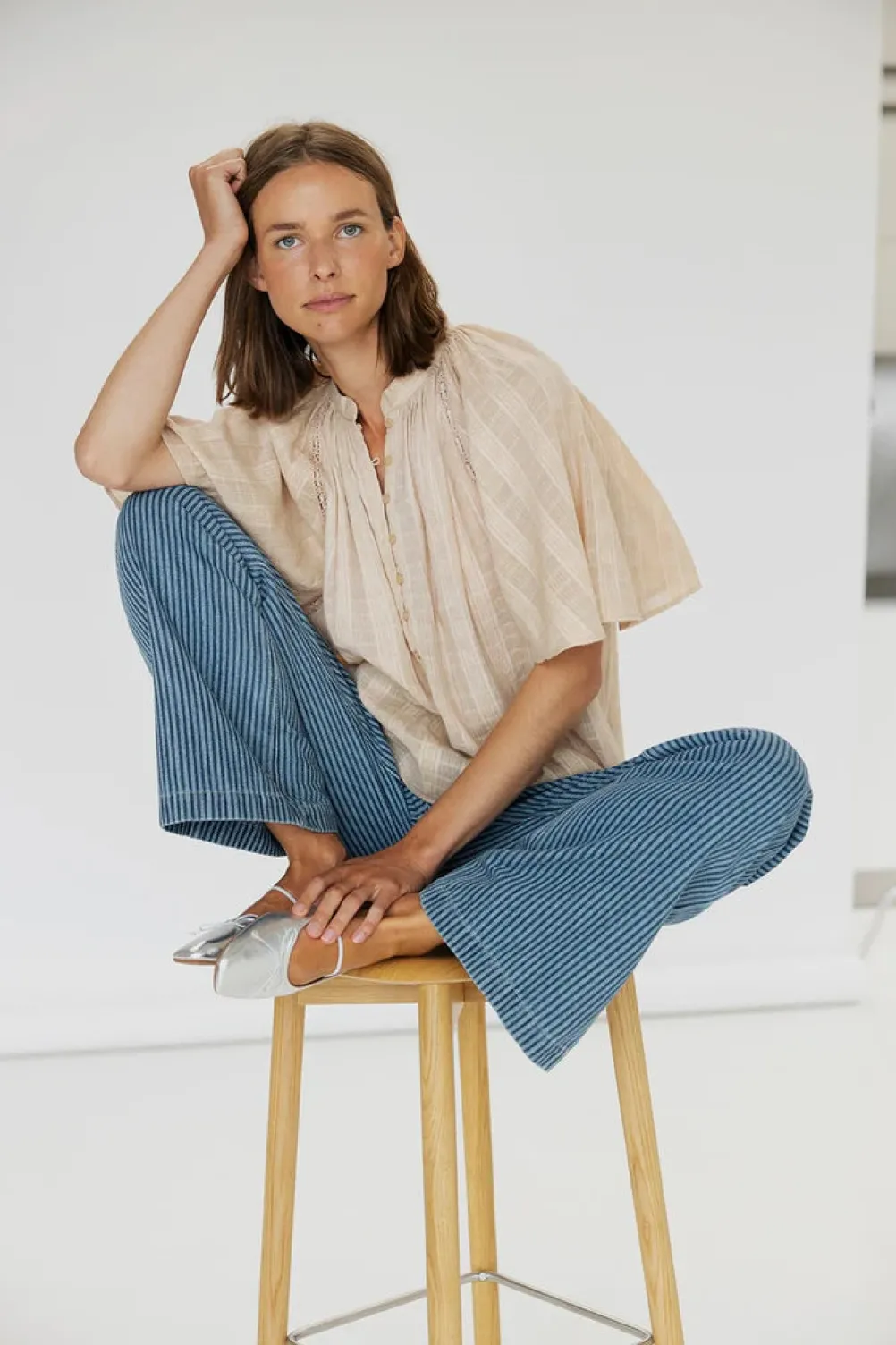 Flotte retro stribede bukser fra Project Aj117 med brede ben og elastik i taljen. Lavet i en blød kvalitet, så de er meget komfortable at bære. Modellen er iklædt en str. M.