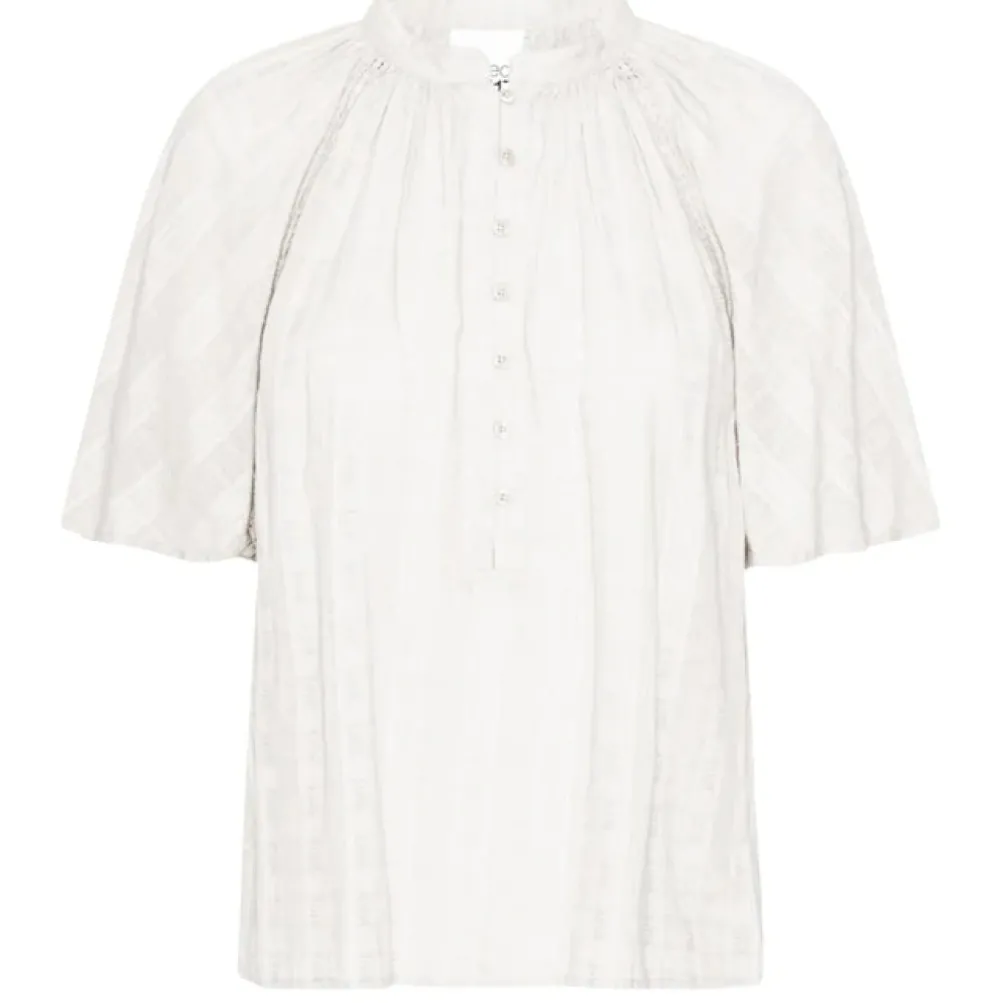 Feminin bluse fra Project Aj117 med fine detaljer. Med korte ærmer, knapper ved brystet og diskret mønster. Lavet i en dejlig blød kvalitet. Kan styles til det meste.