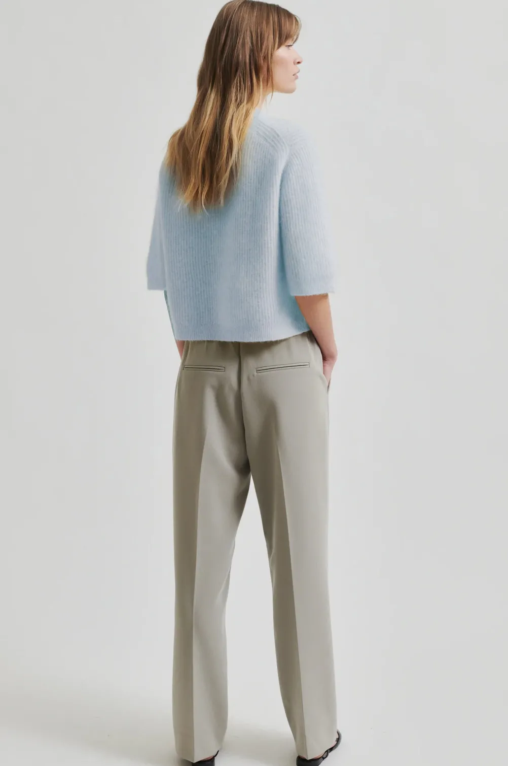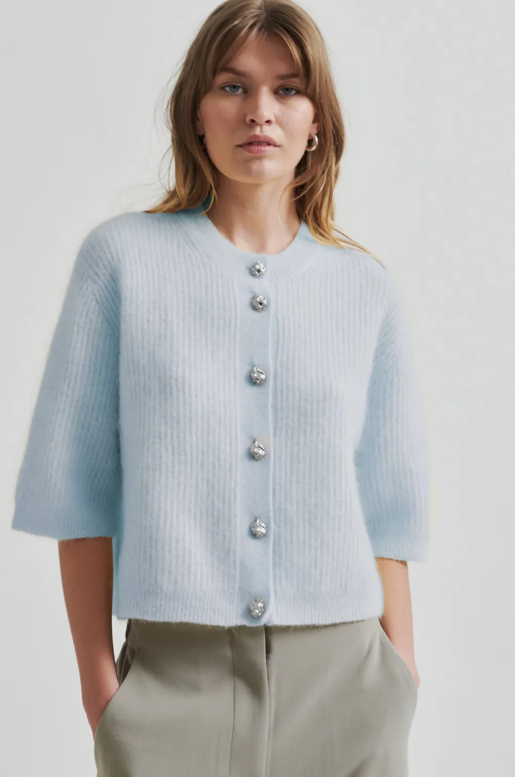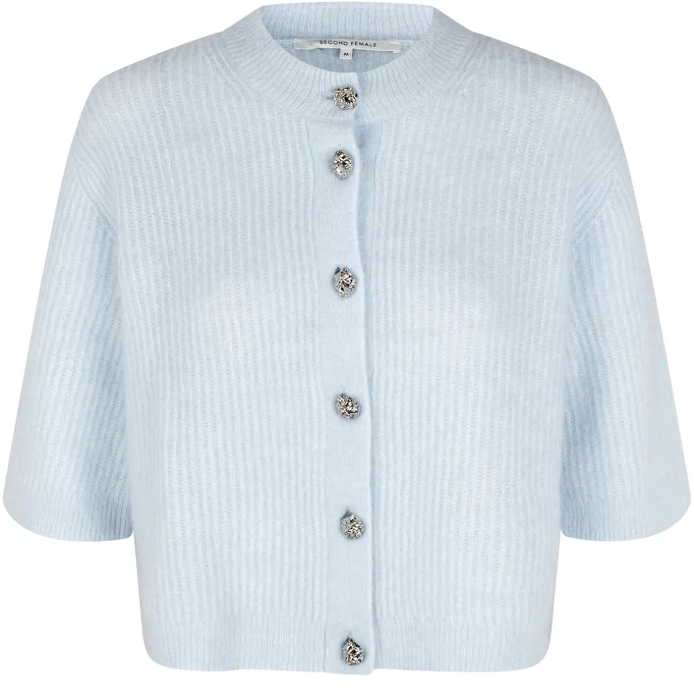 Smuk cardigan fra Second Female fremstillet i en blød ribstrikket mohair- og uldblanding. Med korte ærmer og de fineste knapper.