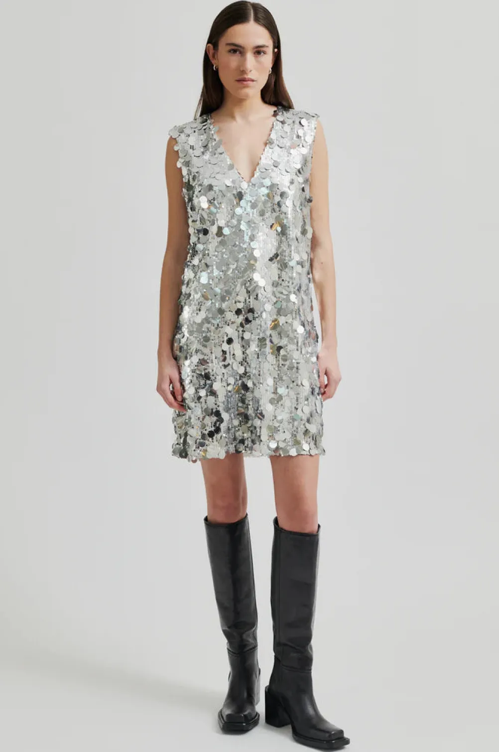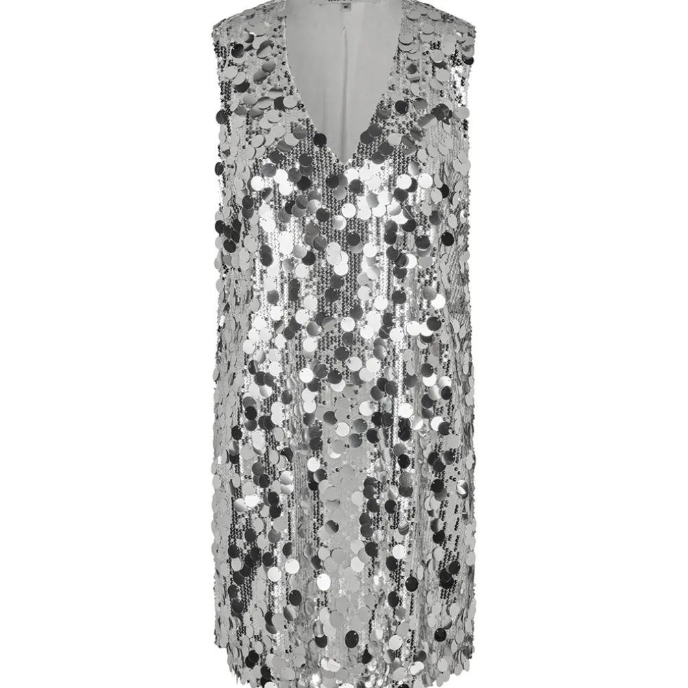 Smuk festlig sølvkjole med palietter fra Second Female. Med v-udskæring og ærmeløst design.