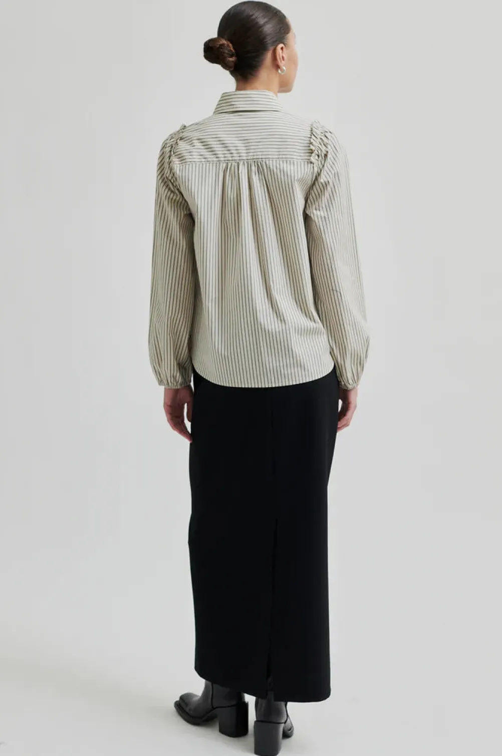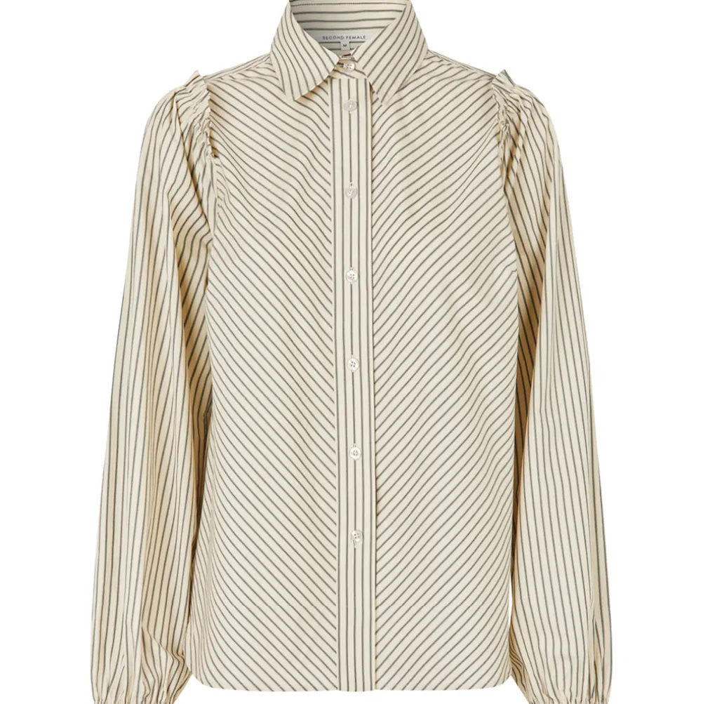 Smuk moderne skjorte fra Second Female med fine flæsedetaljer ved skuldrene. Med tynde striber, klassisk krave og knaplukning langs fronten.