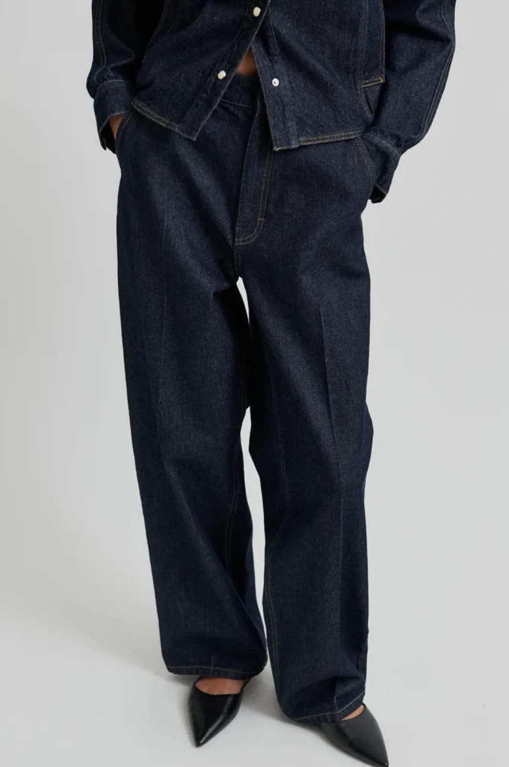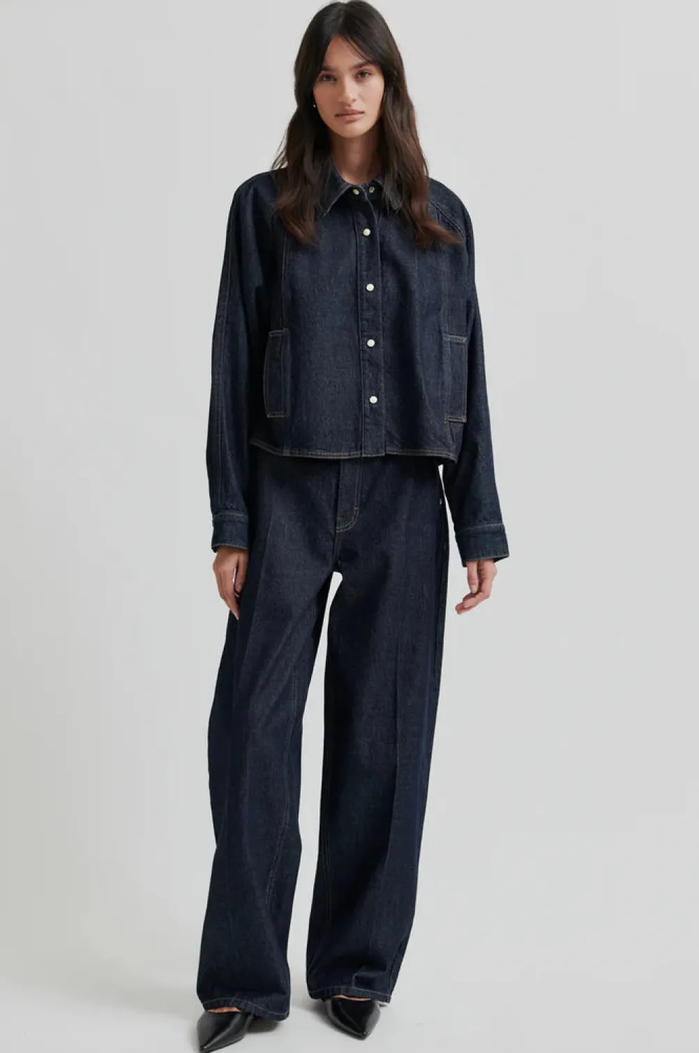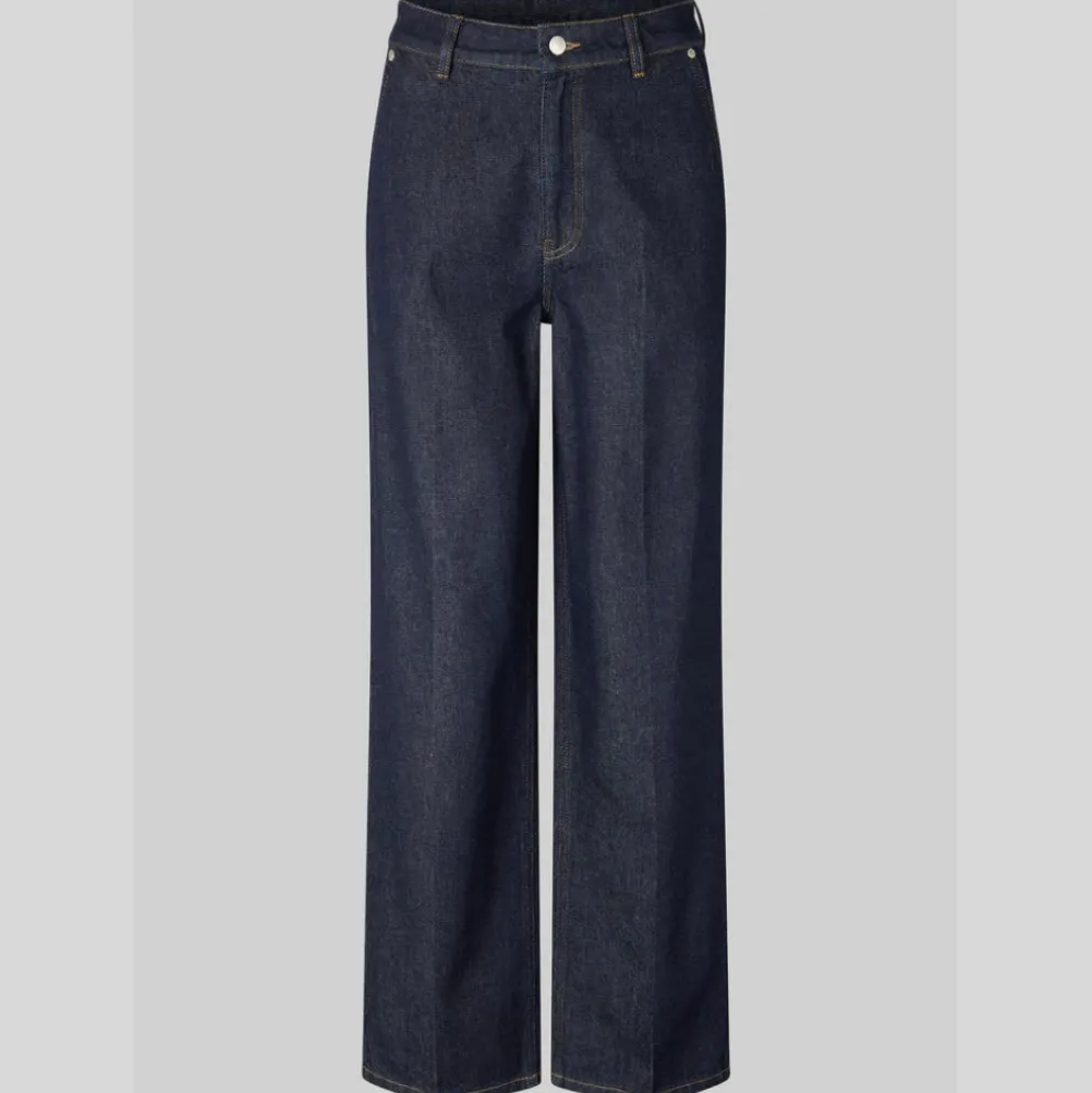 Cool mørkeblå jeans fra Second Female designet i en afslappet pasform med brede ben og høj talje. Med fine pressefoldere, som giver et elegant udtryk.