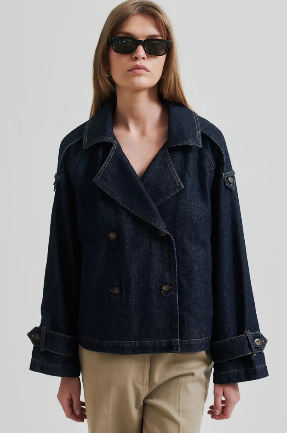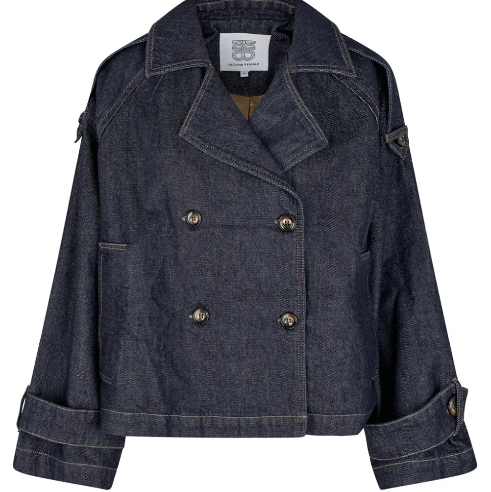 Super cool kort trenchcoat i denim fra Second Female. Med dobbelttradet lukning.