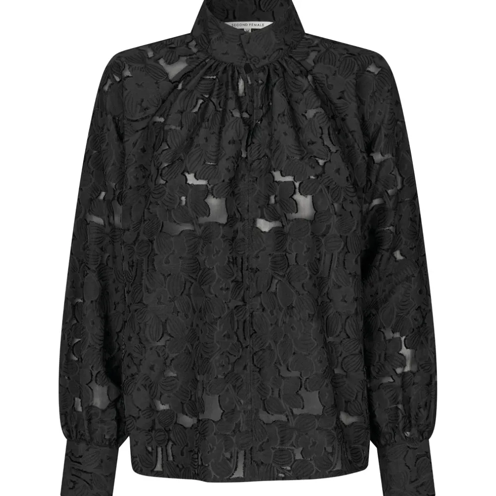 Smuk blondebluse fra Second Female med fine detaljer! Med høj hals med knaplukning og lange ærmer med manchetter. Perfekt til både hverdag og fest.