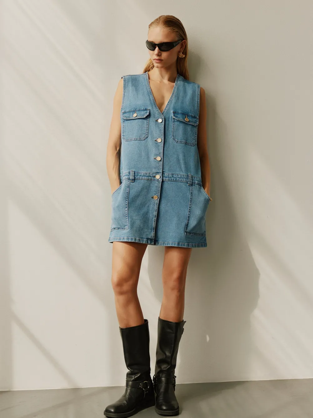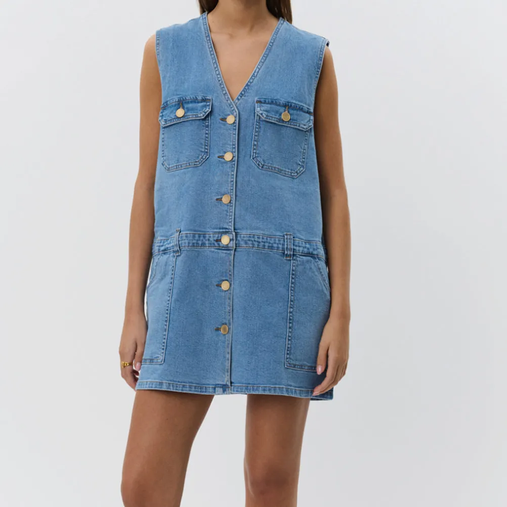 Smuk ærmeløs blå denimkjole fra Sofie Schnoot med v-udskæring og fine guldknapper. Med sidelommer og brystlommer.