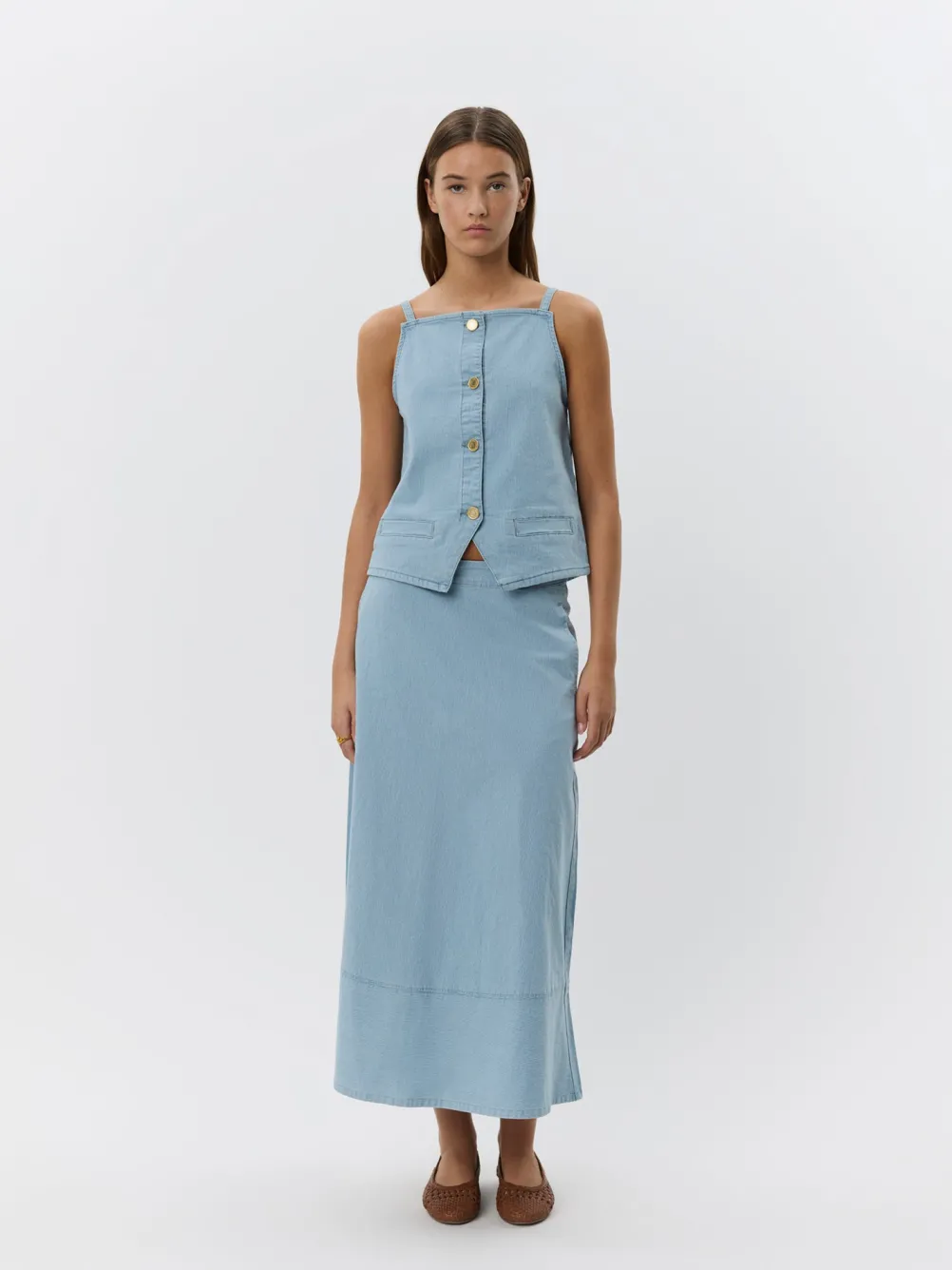 Flot lyseblå vest/top fra Sofie Schnoor med tynde striber og flotte guldknapper.