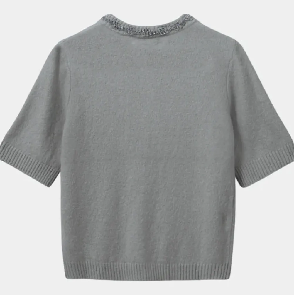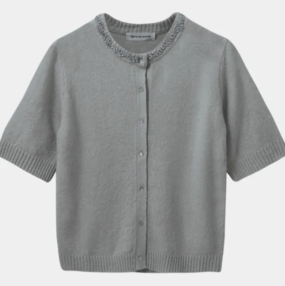Smuk cardigan fra Sofie Schnoor med flotte similisten ved halsudskæringen. Med korte ærmer.