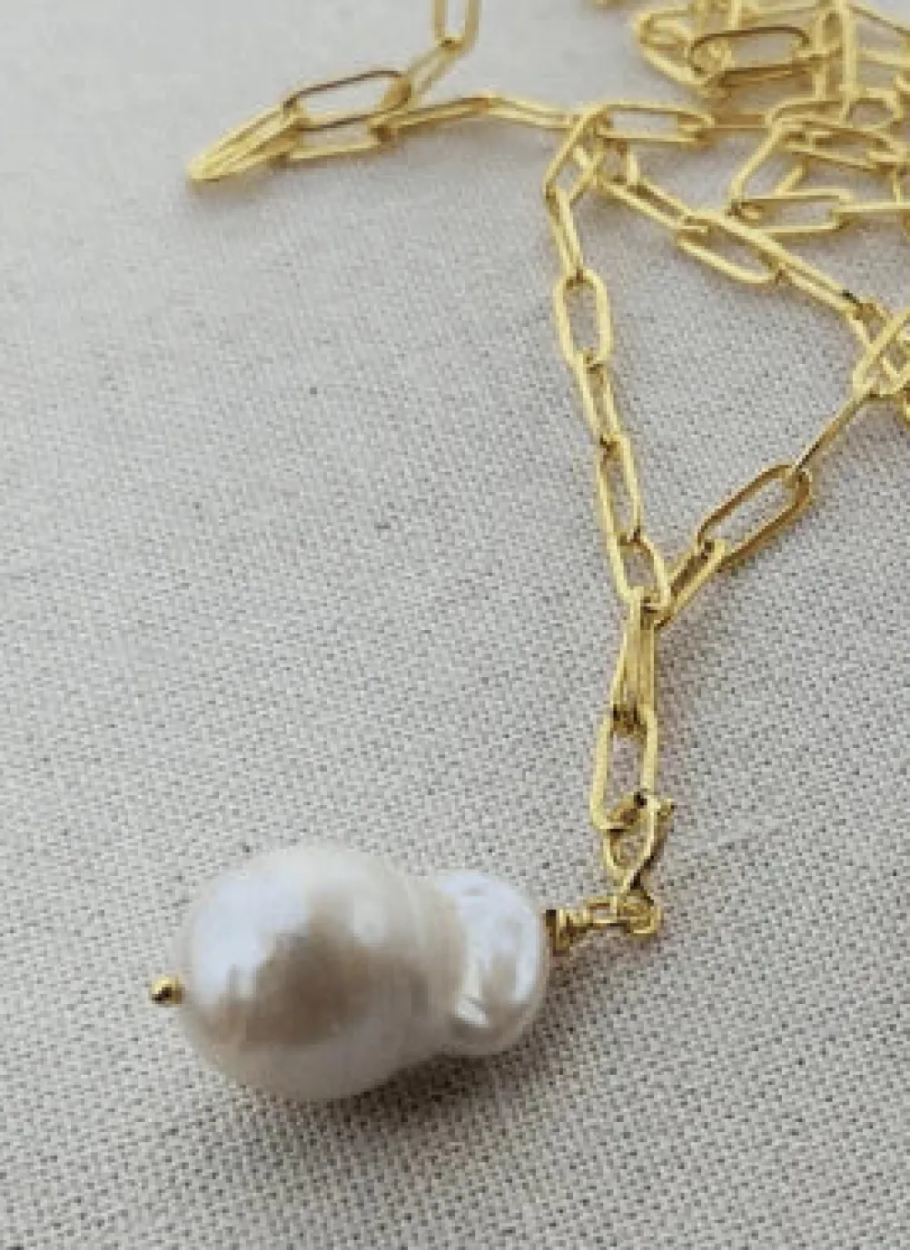 Materiale: 18 karat guldbelagt messing og ægte ferskvandsperle. / Længde: 51 cm