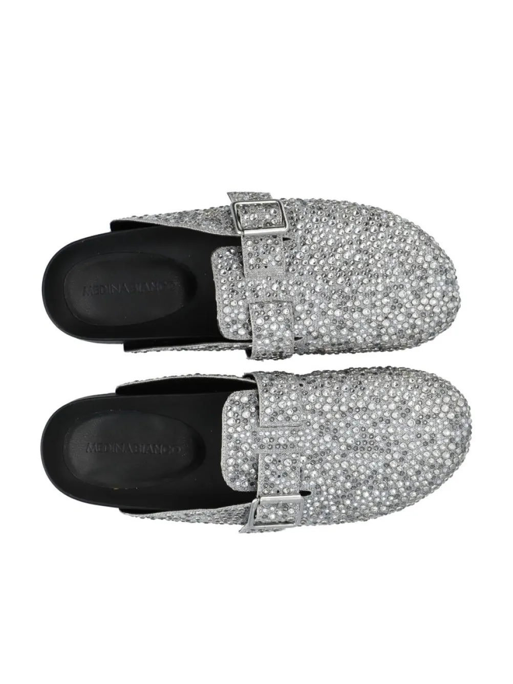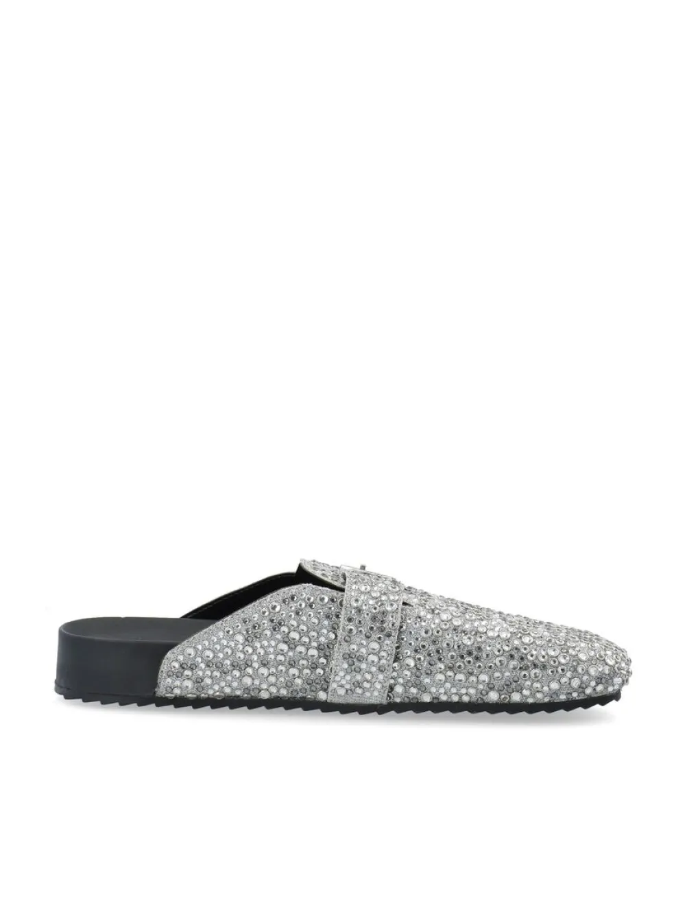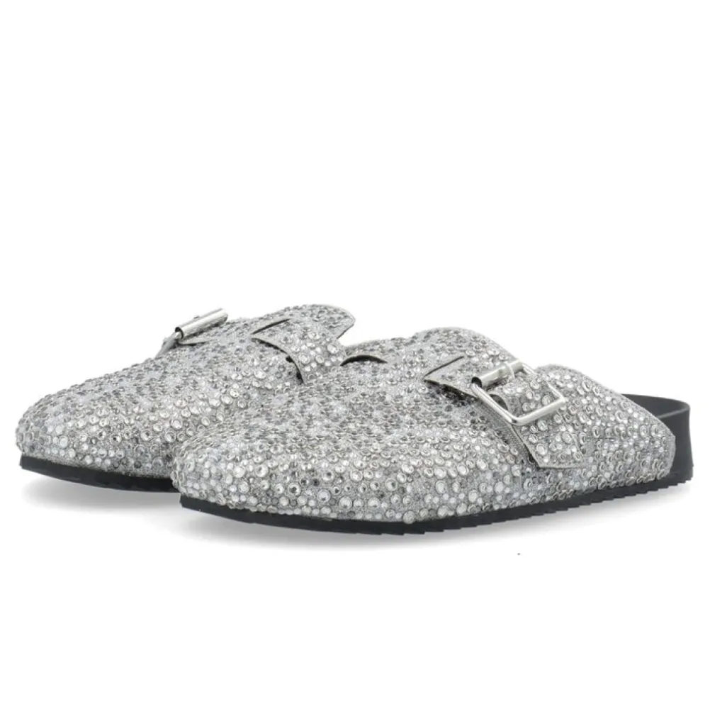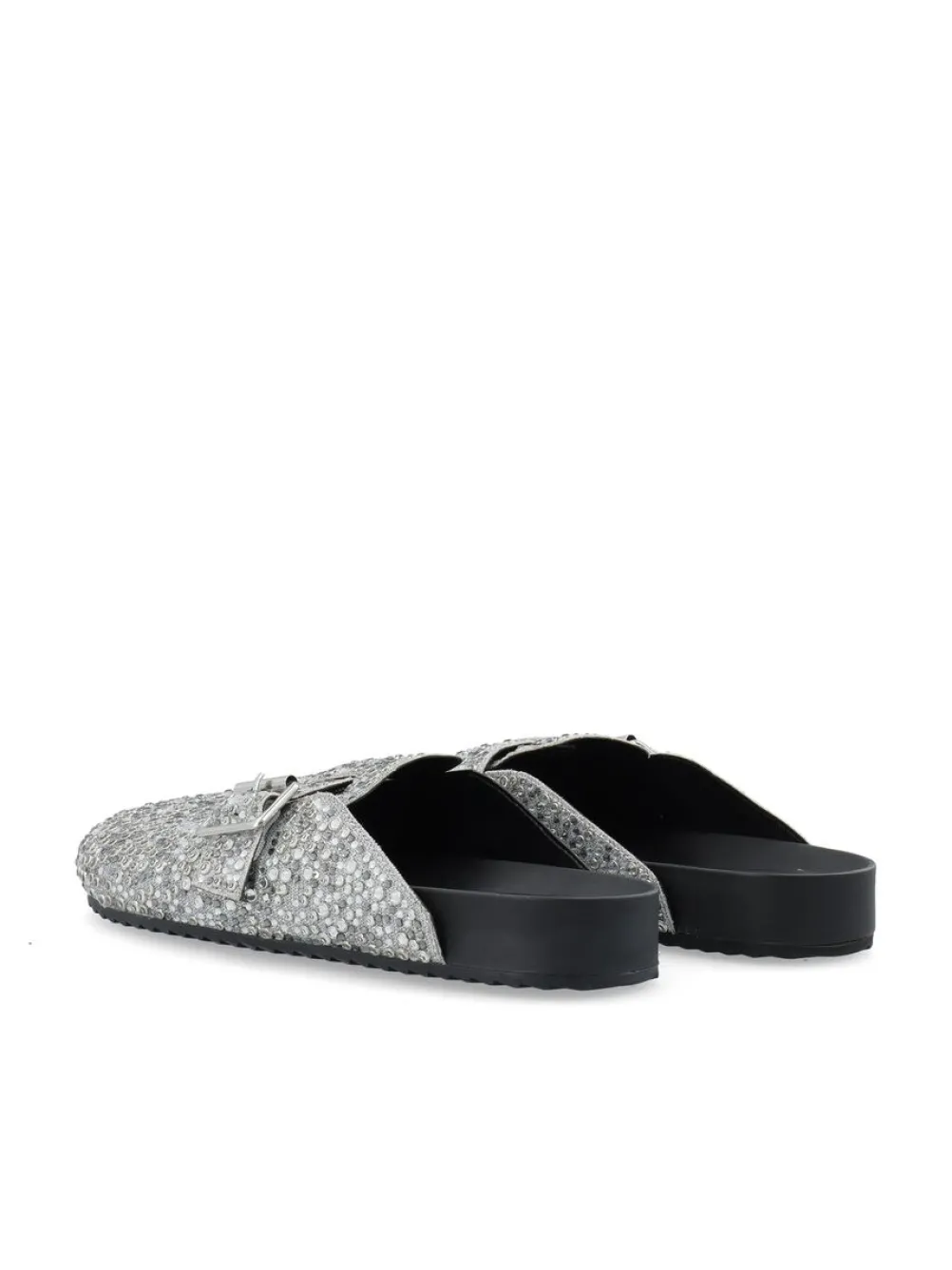 Smukke slippers fra Bianco Medina kollektionen. Med overstykke i stof og rhinsten.