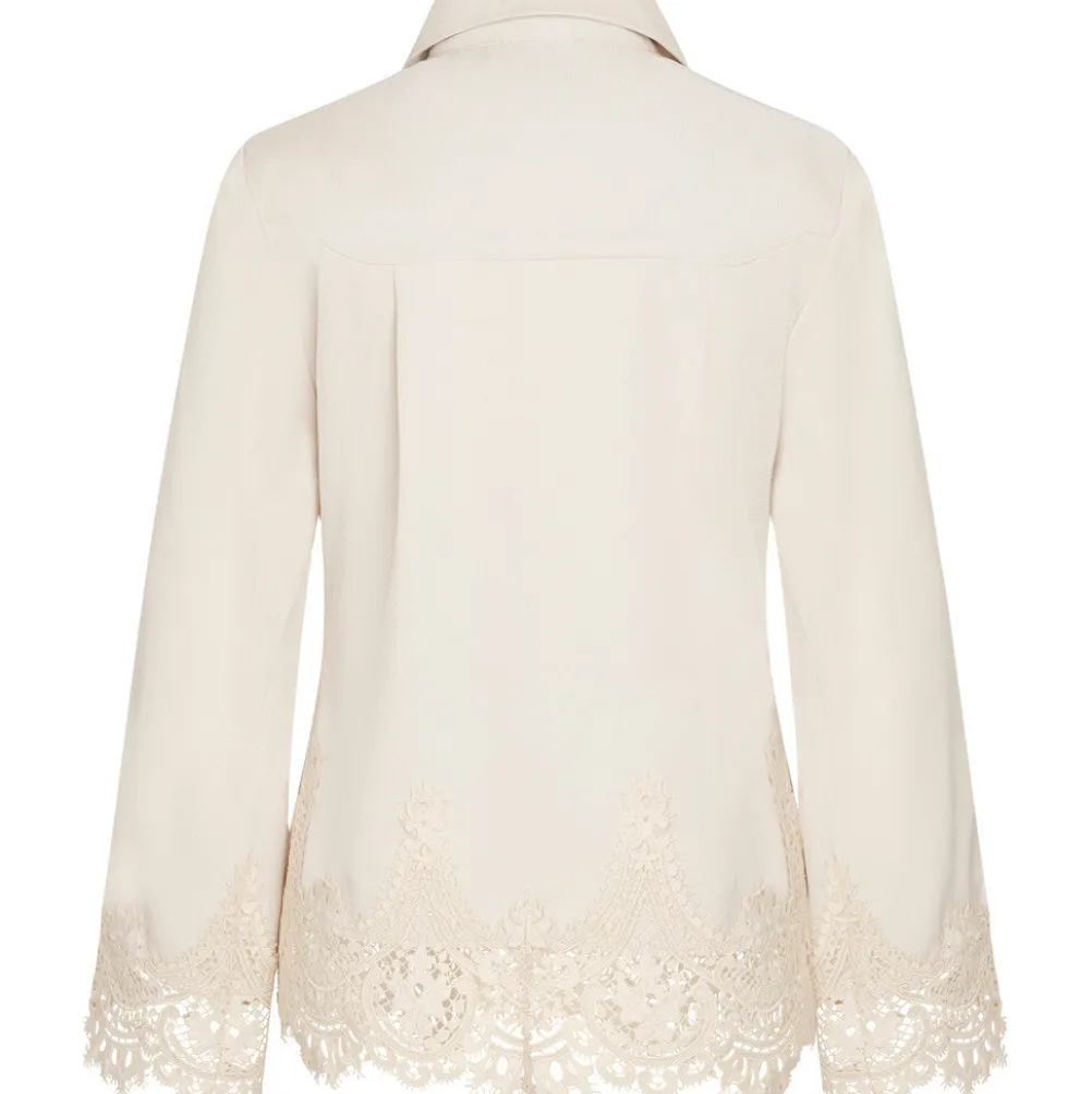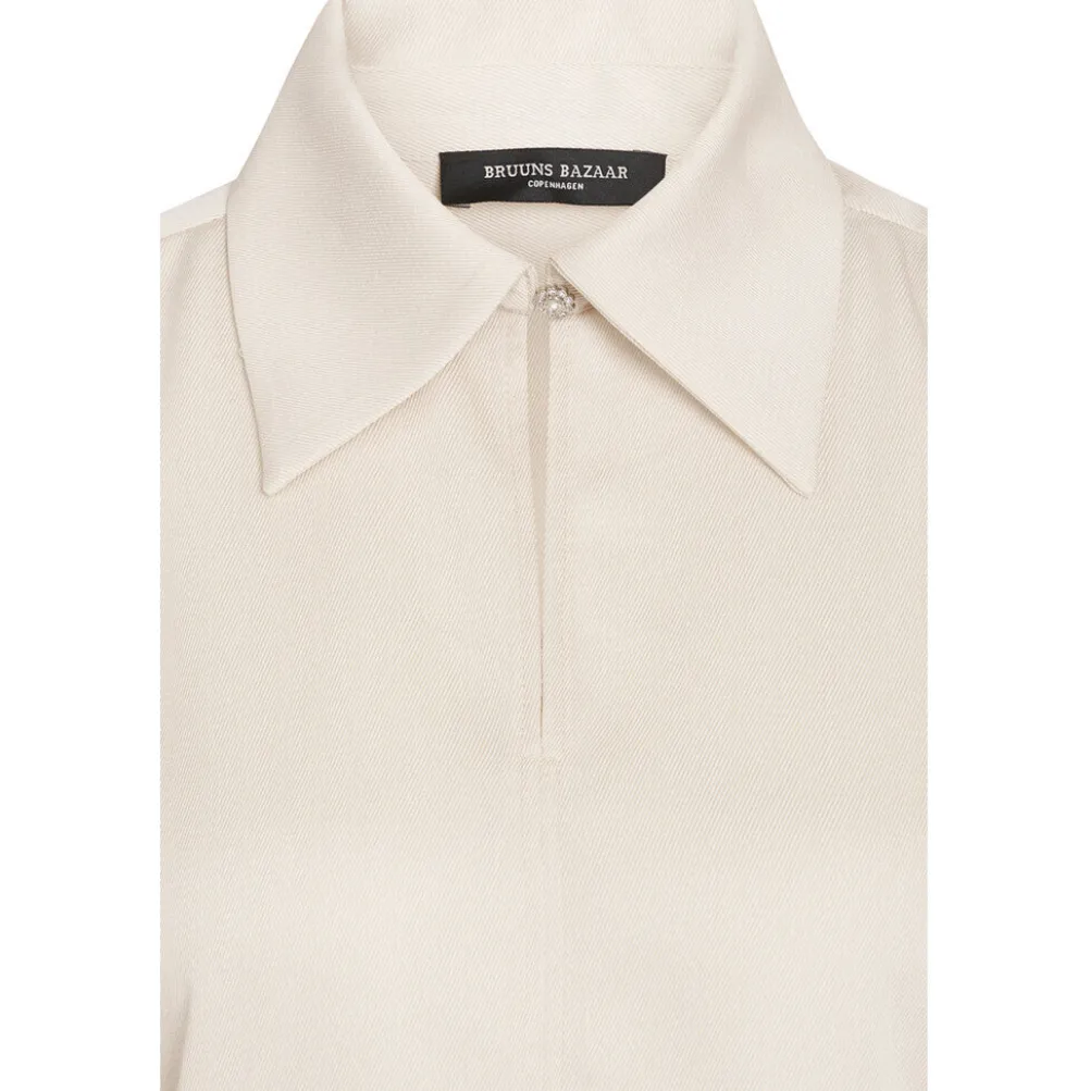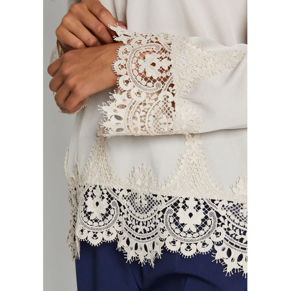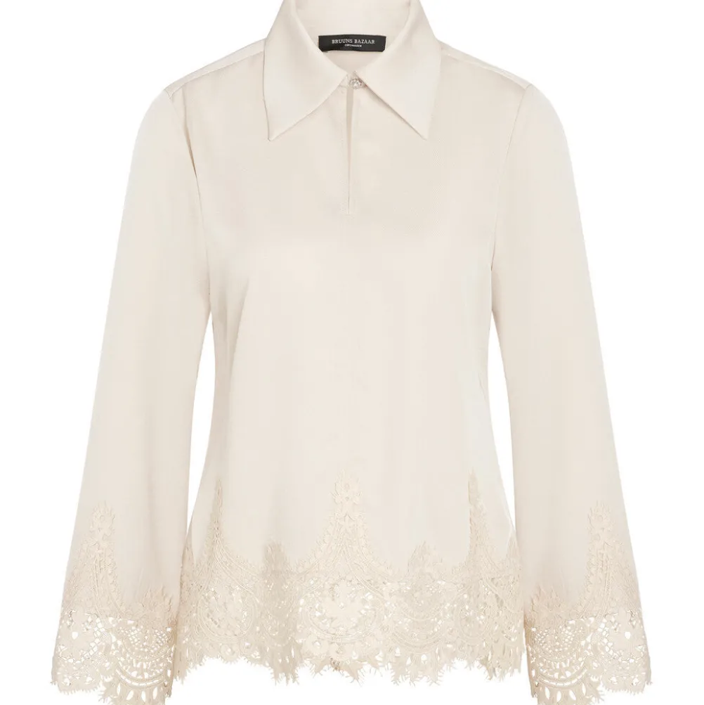 Super smuk skjorte/bluse fra Bruuns Bazaar med fine detaljer! Skjorten har høj hals, små knapper og let gennemsigtige blonder forneden. Perfekt til både hverdag og fest.