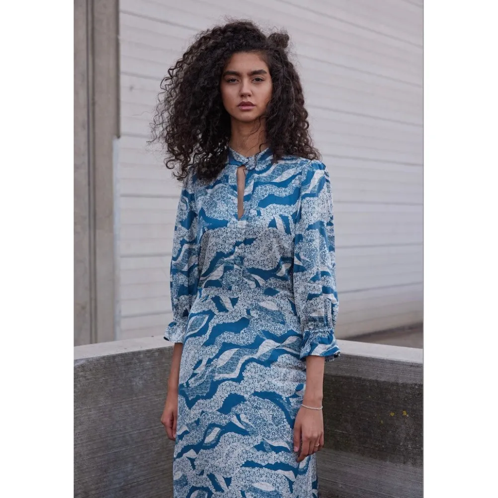 Smuk lang kjole fra Bruuns Bazaar med trekvartlange ærmer, kinakrave og en lille udskæring i halsen samt et feminint snit og et super flot print. Perfekt både til hverdag og fest.