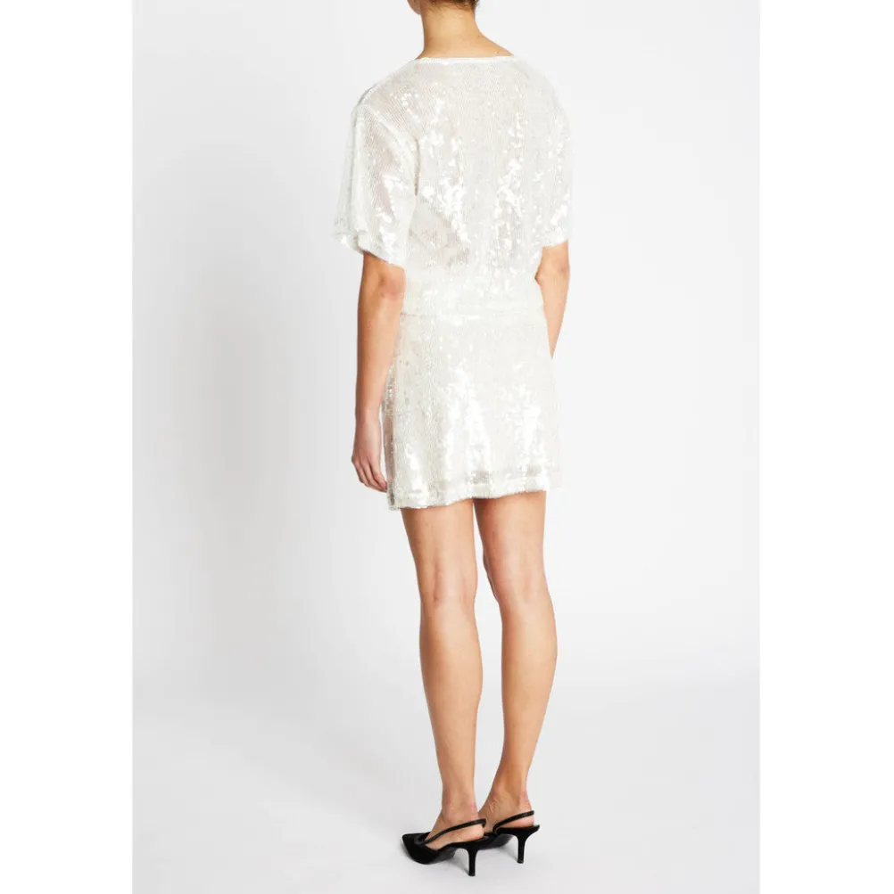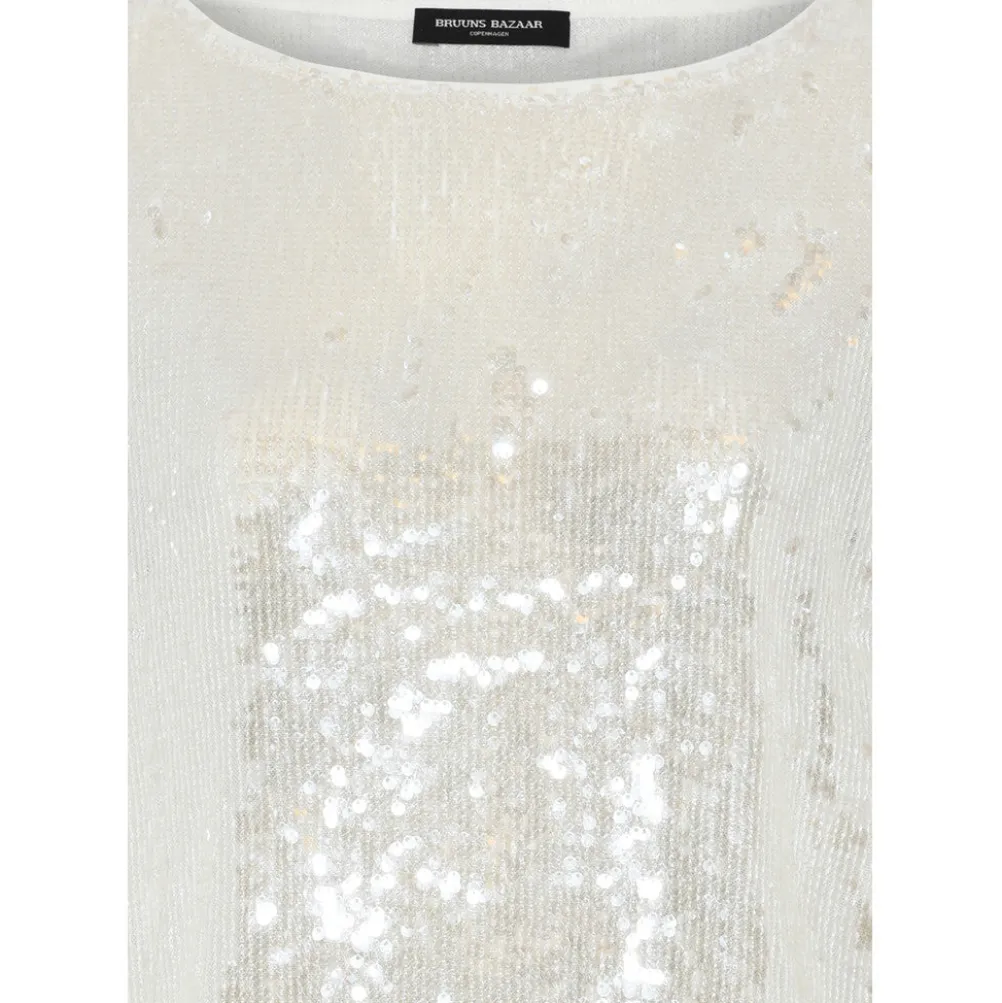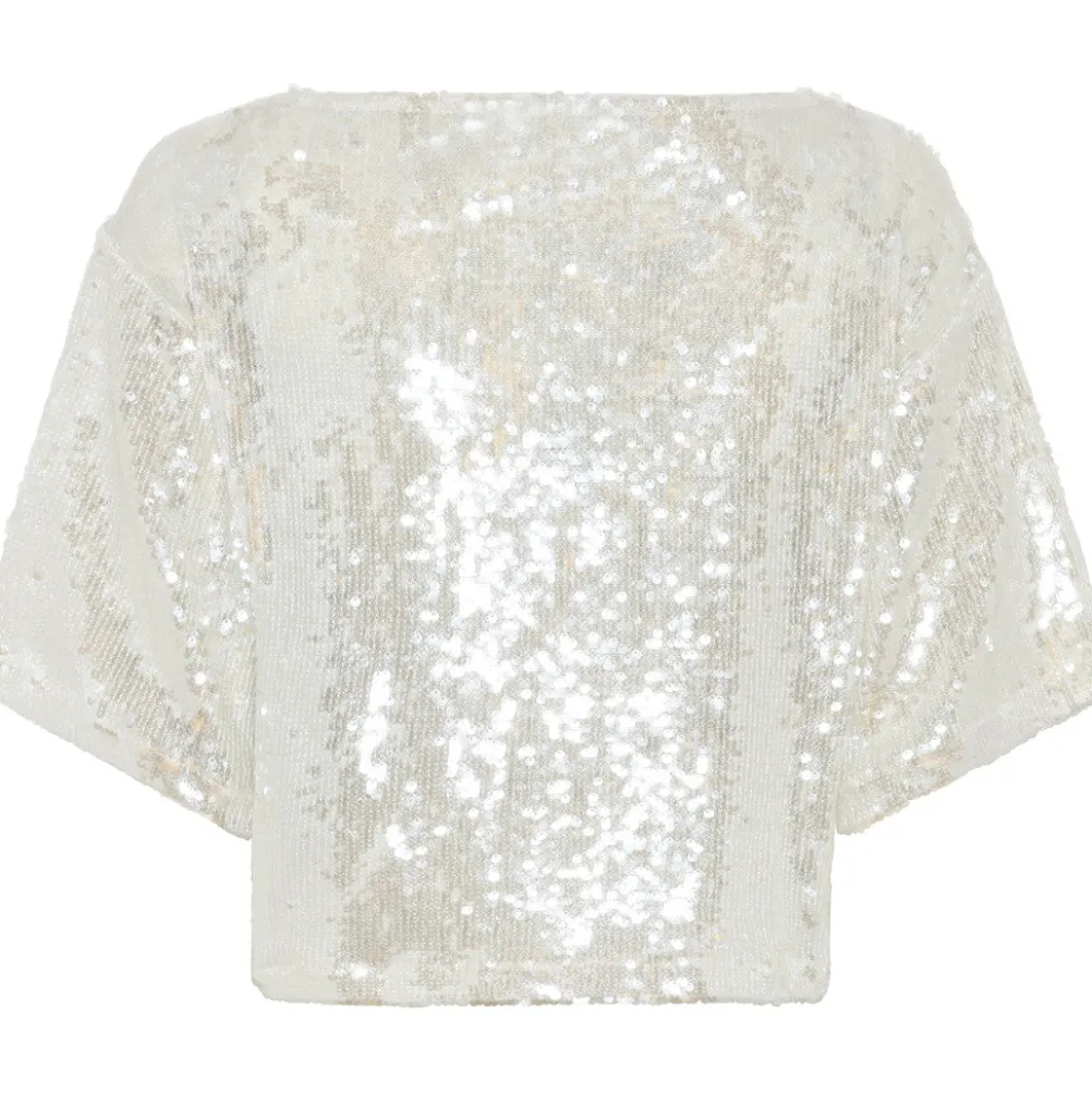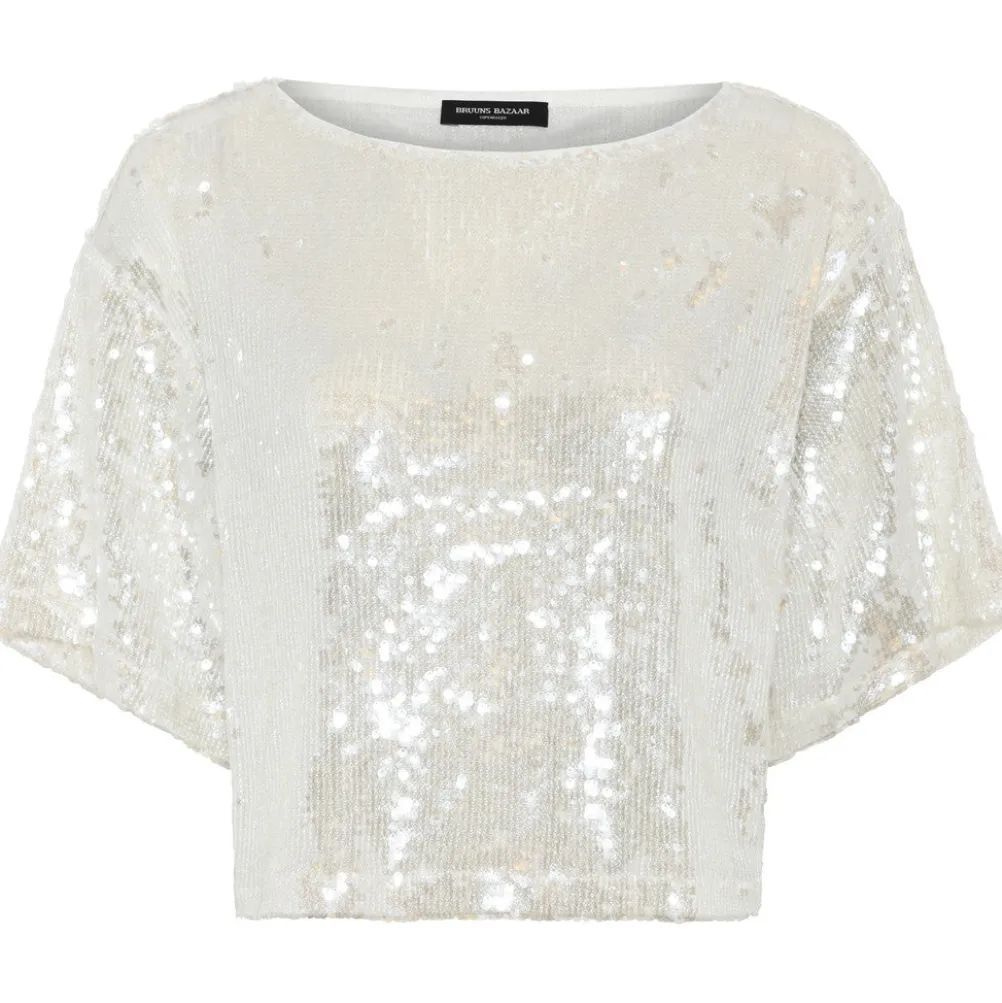 Smuk cropped bluse fra Bruuns Bazaar med flotte skinndende palietter og korte ærmer. Perfekt til de kommende festlige begivenheder.