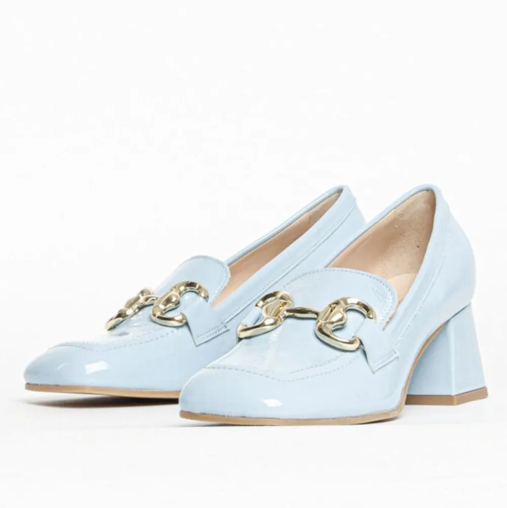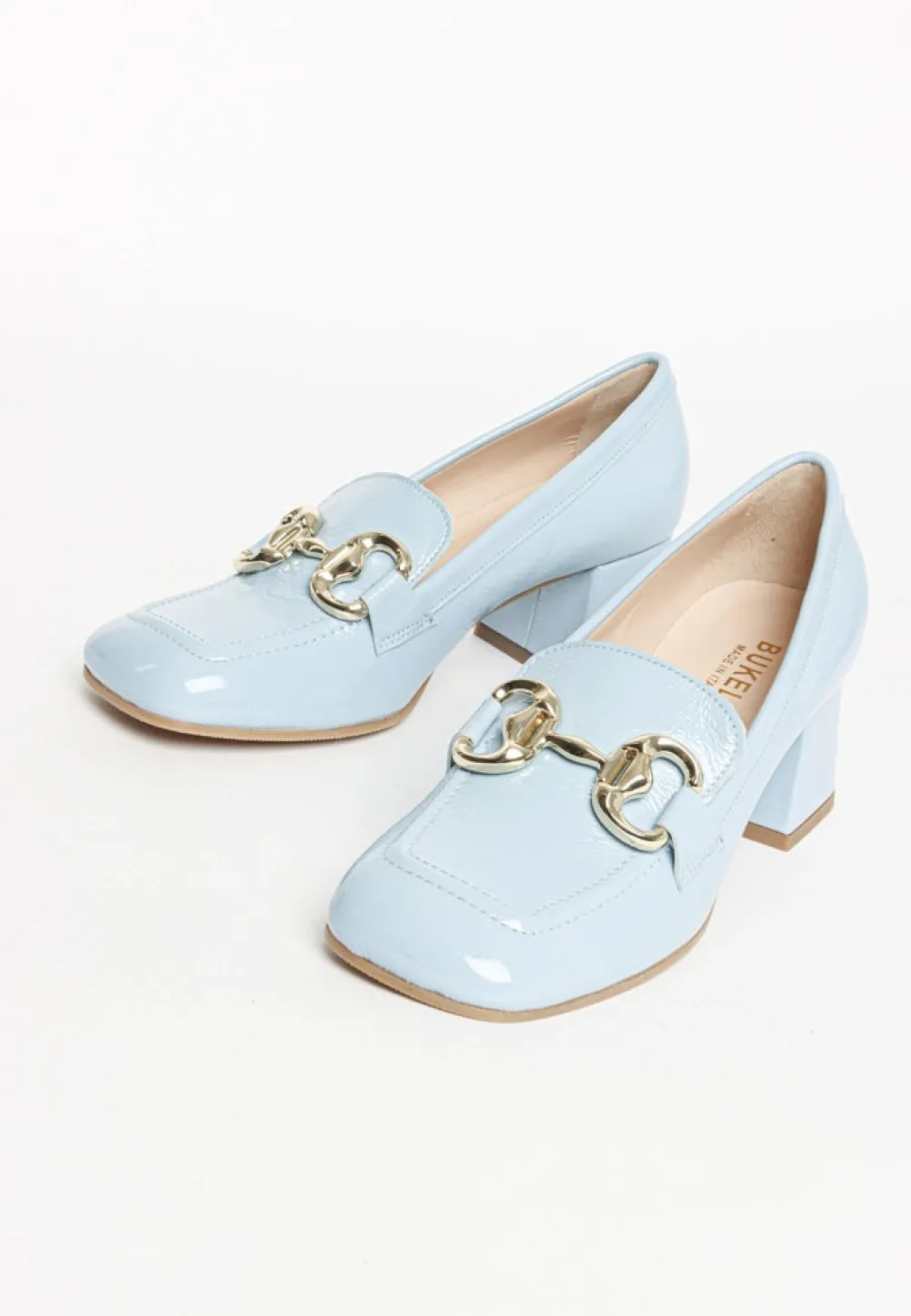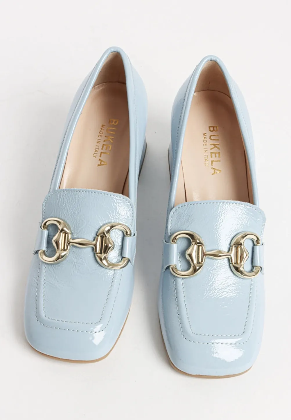 Super smukke lyseblå pumps/loafers fra Bukela med smukke detaljer. Med høj hæl og behagelig pasform. Et must til forårets og sommerens styles.