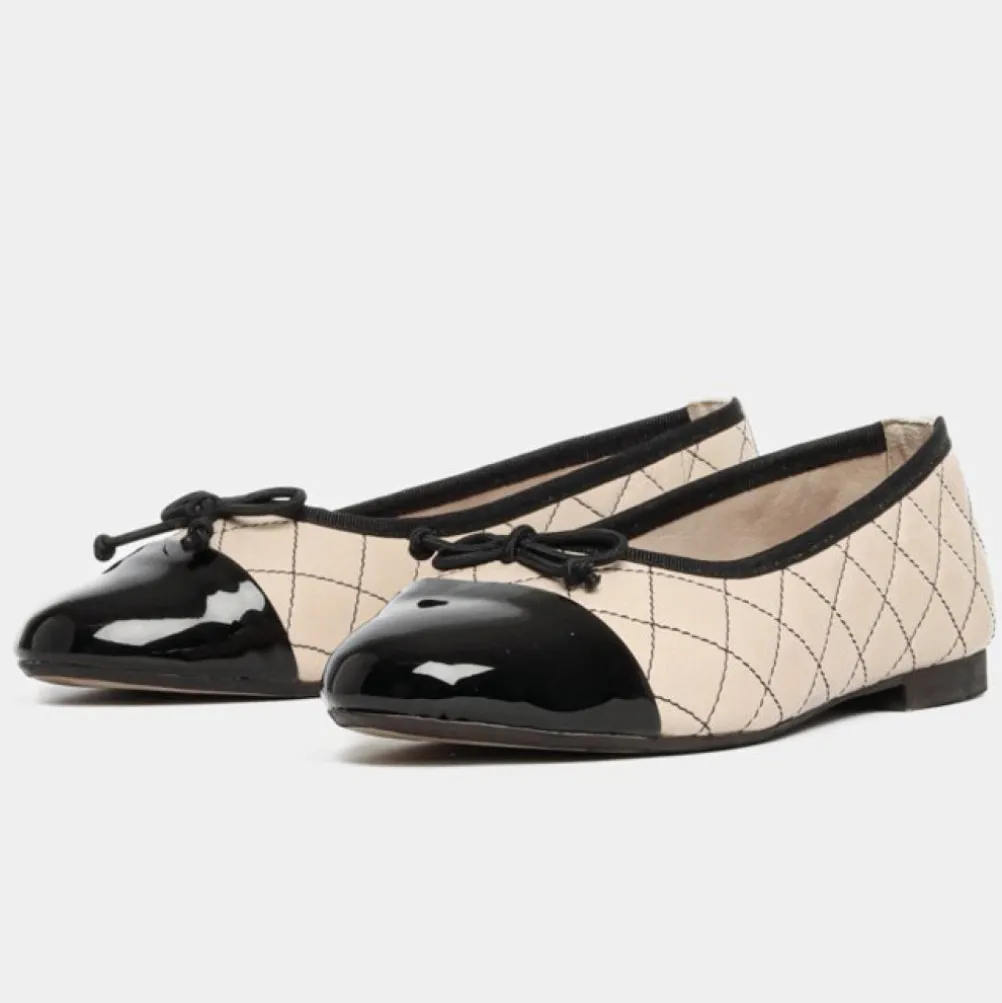 Smukke og eksklusive beige/sorte ballerinaer fra Bukela med fine detaljer! Med quilted mønster og behagelig pasform. Et must til forårets og sommerens styles.