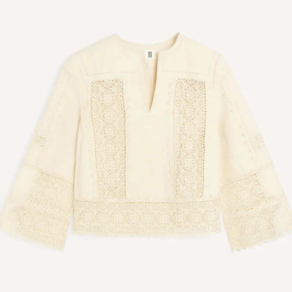Smuk og eksklusiv bluse med de fineste blondedetaljer fra By Malene Birger. Med v-udskæring og brede ærmer. Tidsløs bluse, der kan bruges sæson efter sæson.