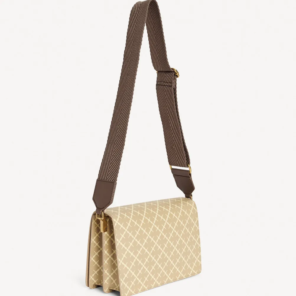 Lækker og klassisk populær skuldertaske med læderdetaljer fra Malene Birger med det velkendte signaturmønster. Med aftagelig og justerbar bomuldsrem. Magnetisk lukning.