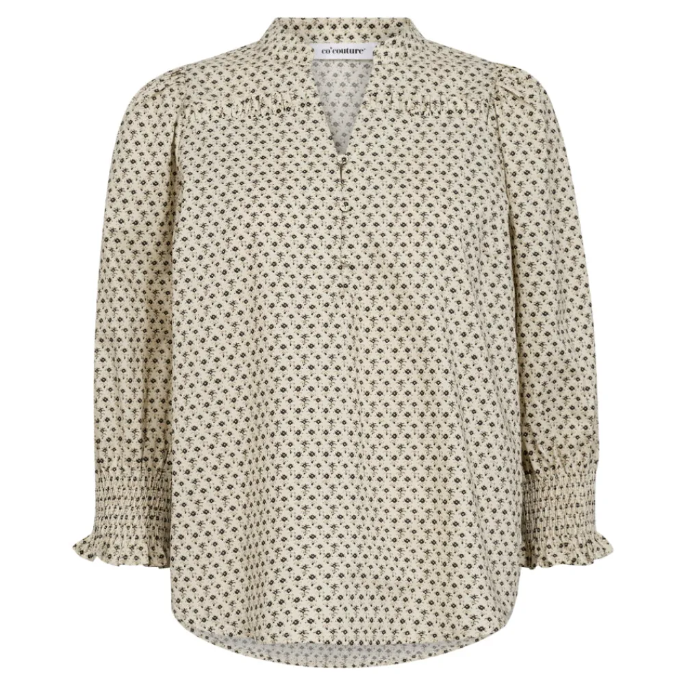Flot og elegant bluse fra Co’couture med mønster. Med smock ved ærmerne og lille v-udskæring med knapper. Små flæser på brystet og ved ærmerne.