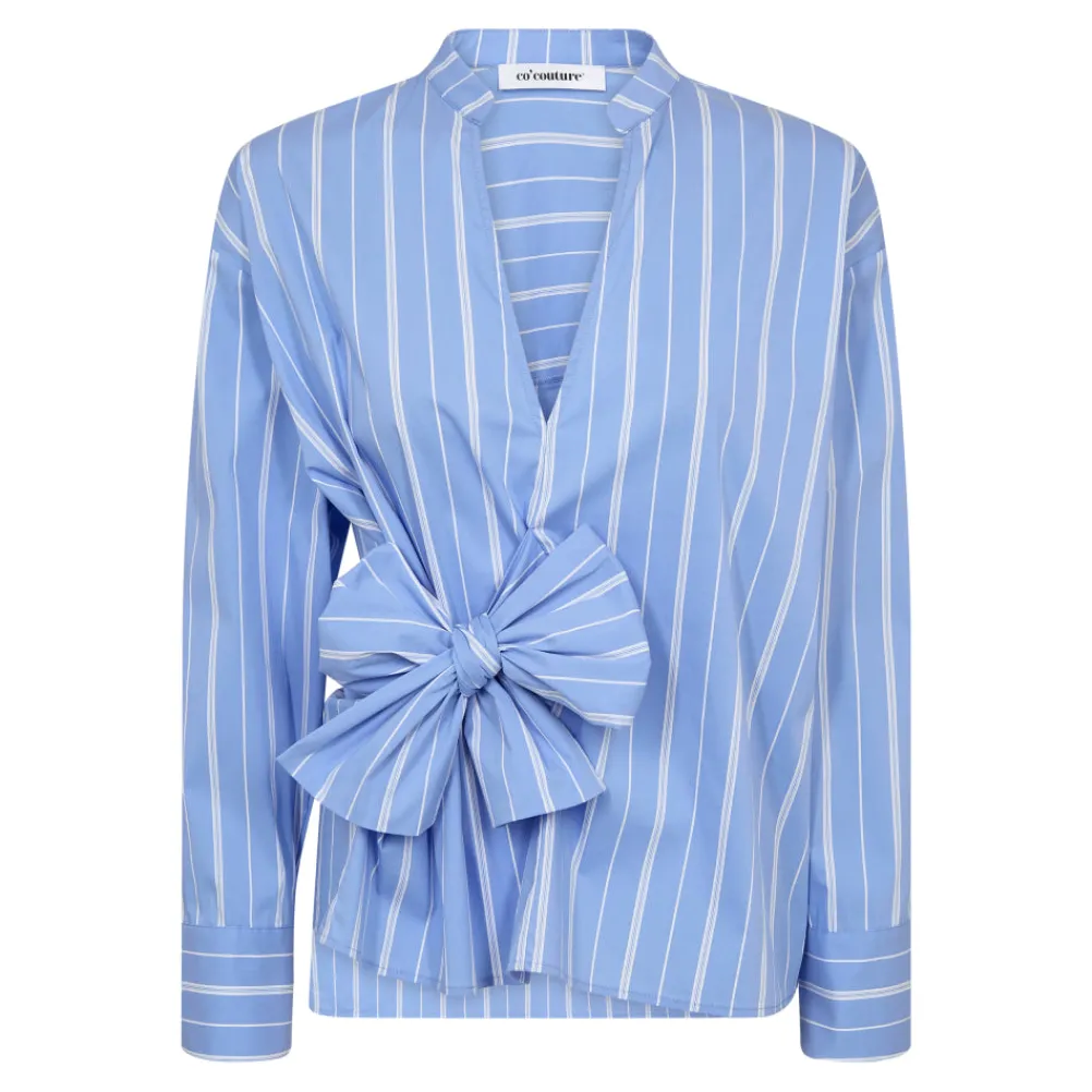 Elegant stribet bluse fra Co’couture med fine detaljer! Med v-udskæring og fin sløjfe i taljen.