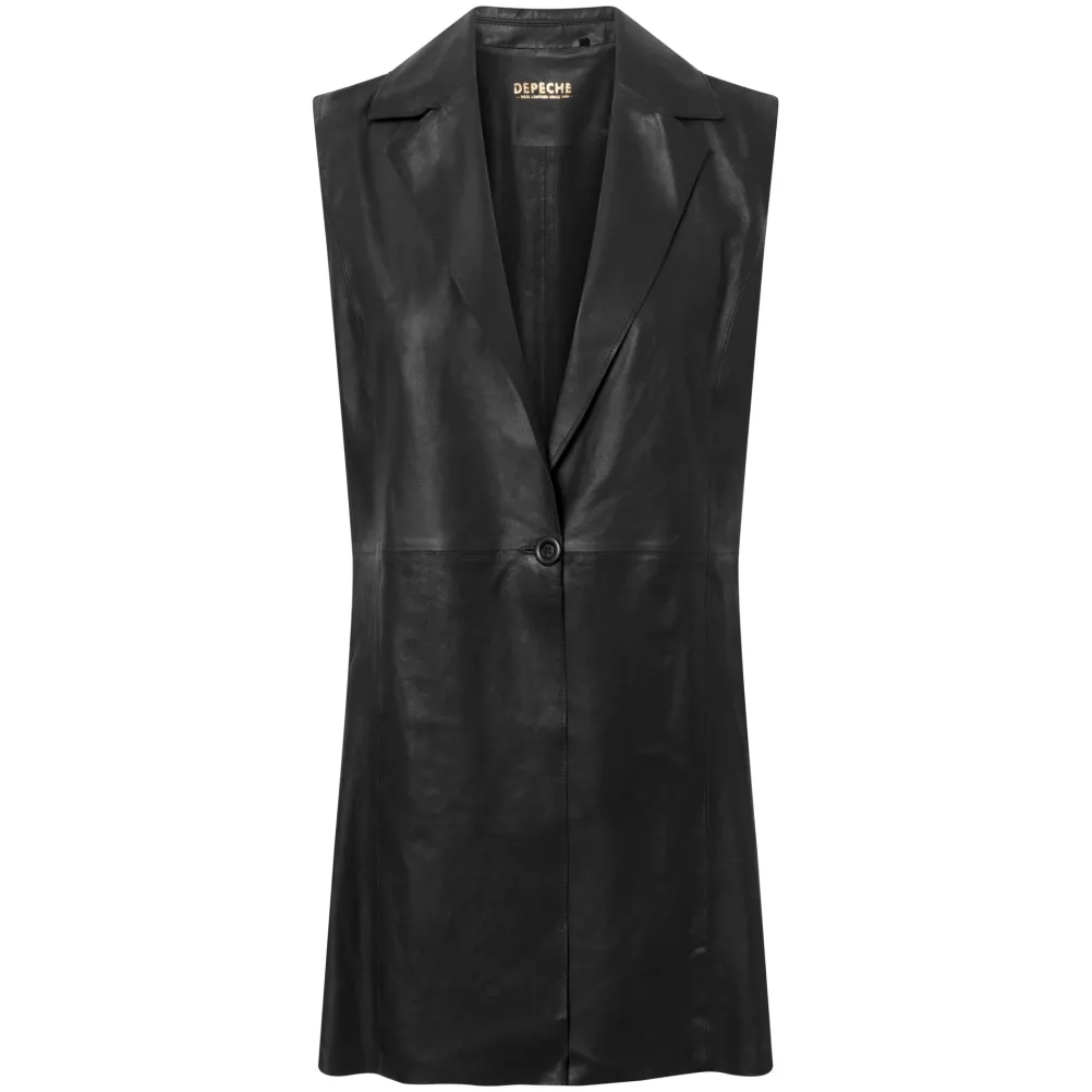 Super lækker sort skindvest fra Depeche. Lavet i en dejlig blød kvalitet. Lukkes med en enkelt knap foran. Style over bluser og kjoler.