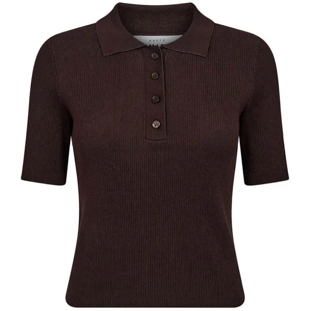 Klassisk moccafarvet polo fra Haute L’amitié designet i et enkelt stilrent snit med klassisk krave og stolpelukning med knapper. Med korte ærmer.