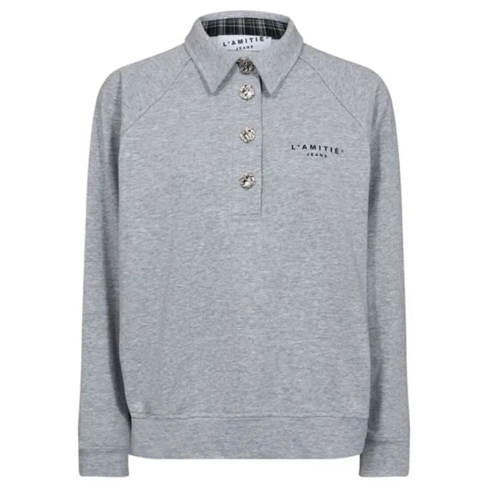Klassisk grå strikket polo fra Haute L’amitié med klassisk krave og smukke sølvfarvede knapper. Sweat shirt look.