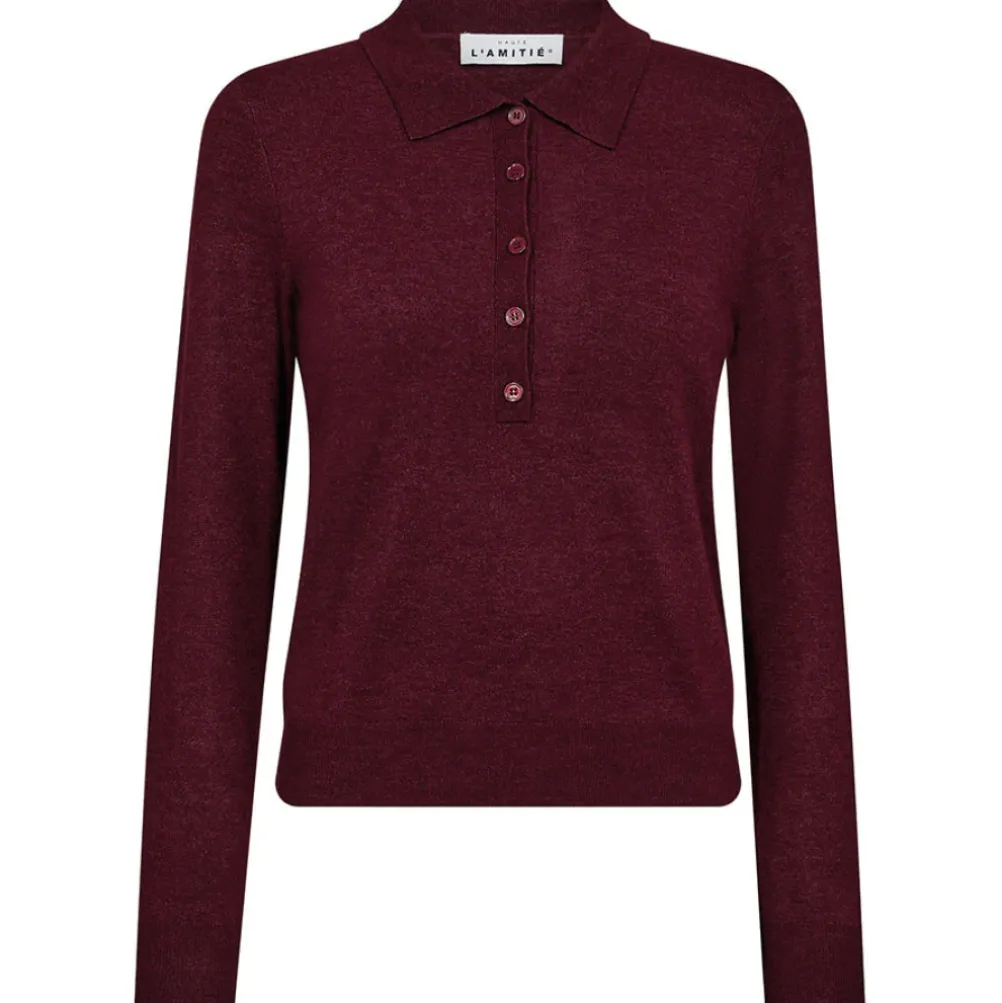 Klassisk vinrød strikket polo fra Haute L’amitié designet i et enkelt stilrent snit med klassisk krave og stolpelukning med knapper.