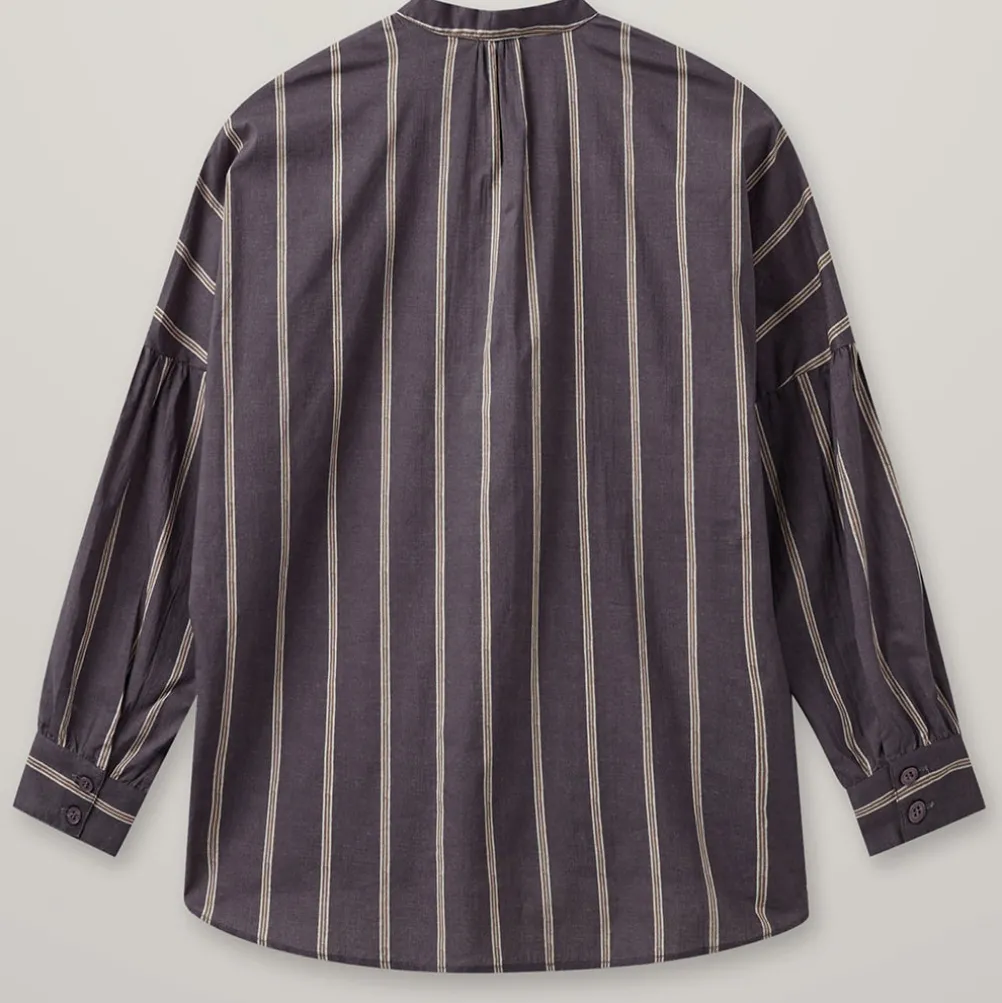 Smuk let skjorte fra Heyanno med striber og håndbroderede detaljer. Med sænkede skuldre og mandarinkrave.