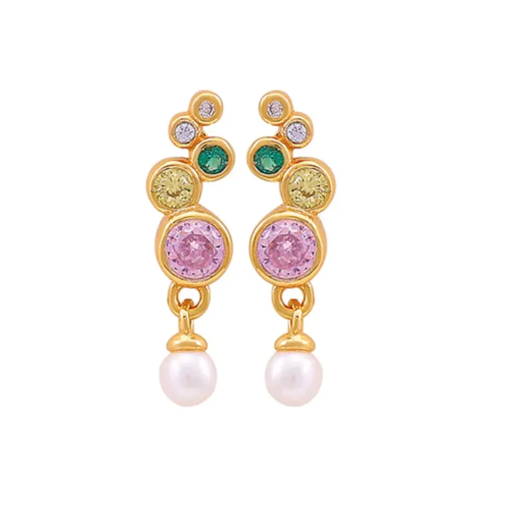 Smukke øreringe fra Hultquist Copenhagen med forskellige farver af sten og hvide perler.