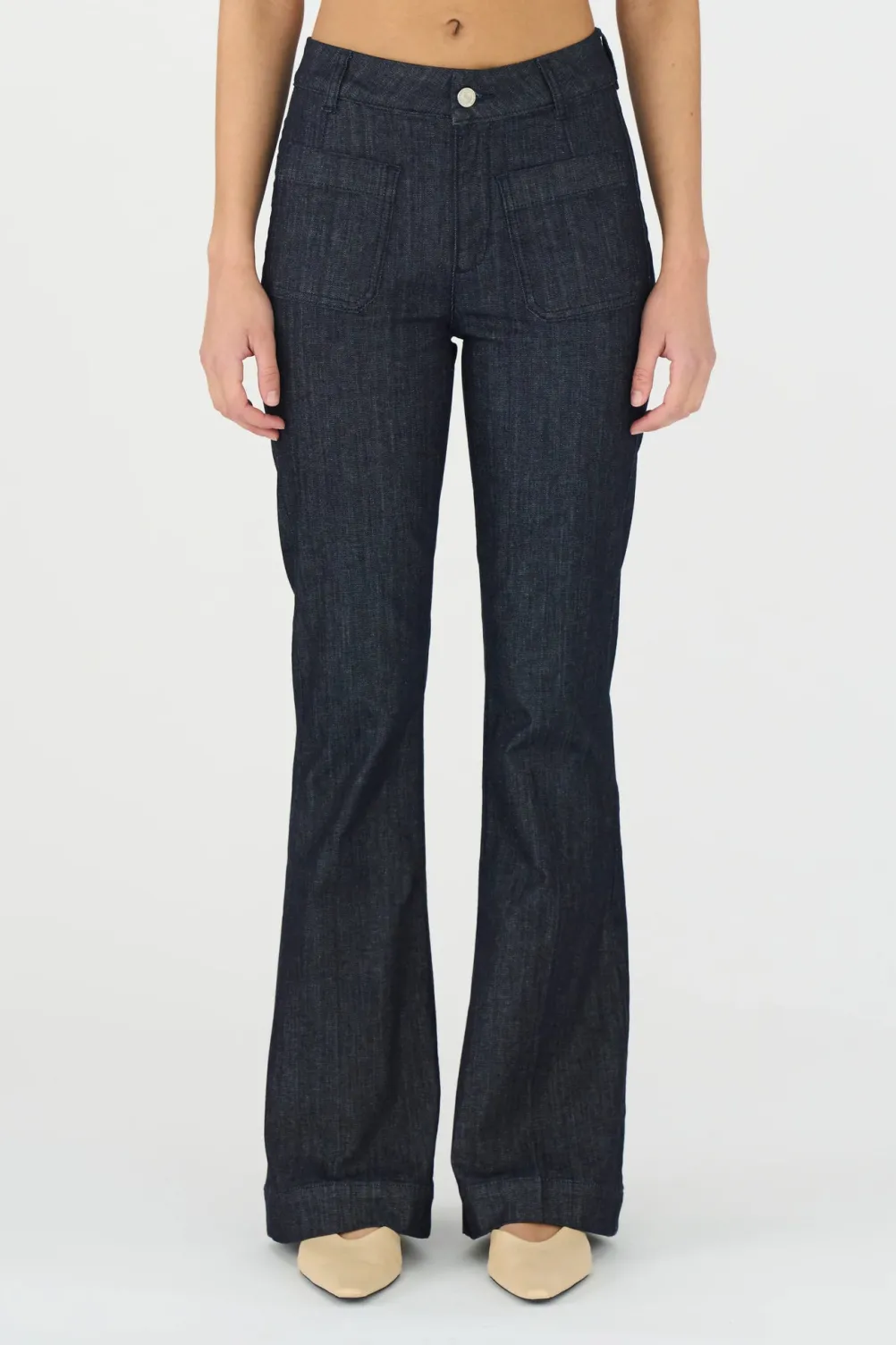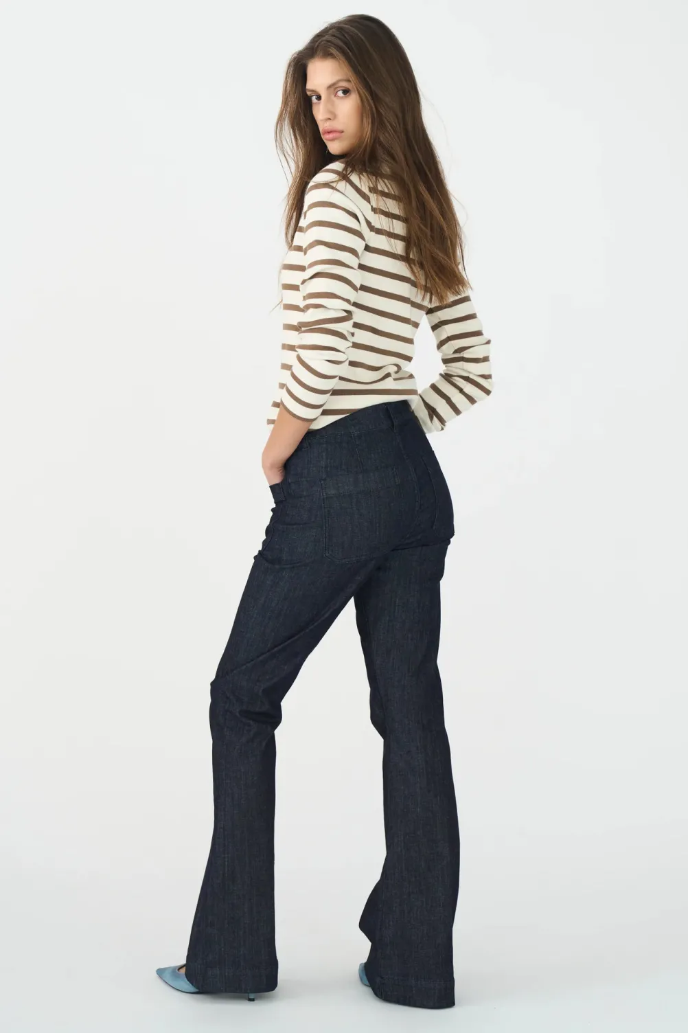 Lækre jeans i flot mørkeblå denim fra Ivy Copenhagen. Bukserne har skinny fit med flare forneden og mellemhøj talje. Bukserne er meget bløde og komfortable og har stretch. Patch-lommer med lynlås og knap.