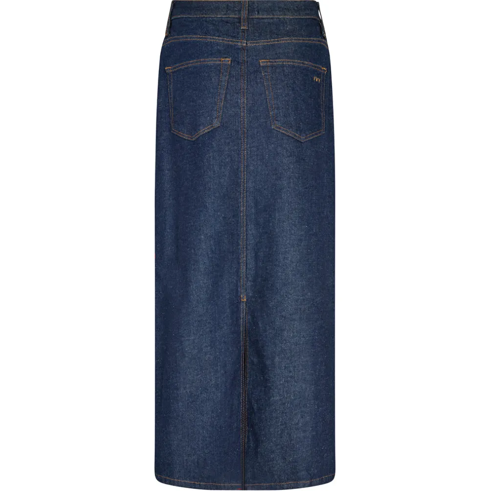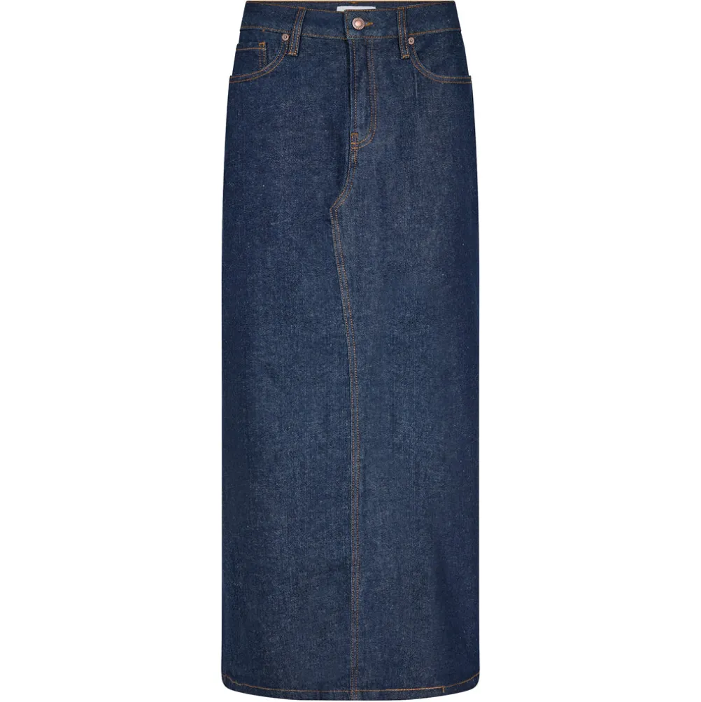 Cool og lang mørkeblå denimnederdel fra Ivy Copenhagen. Med høj talje og asymmetrisk søm, som en cool detalje.