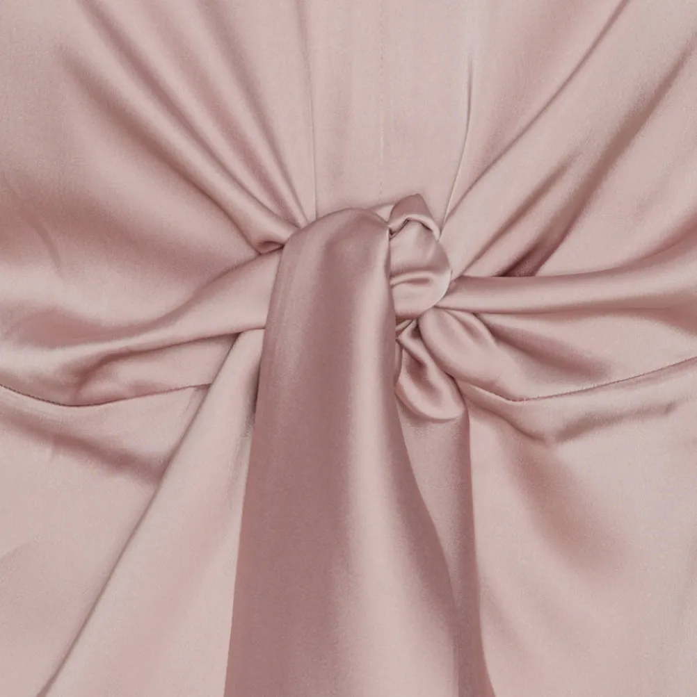 Smuk bluse fra Karmamia i semi rig satin med v-udskæring, knudedetalje og lange ærmer, som kan styles på mange måder. Perfekt både til hverdag og fest.