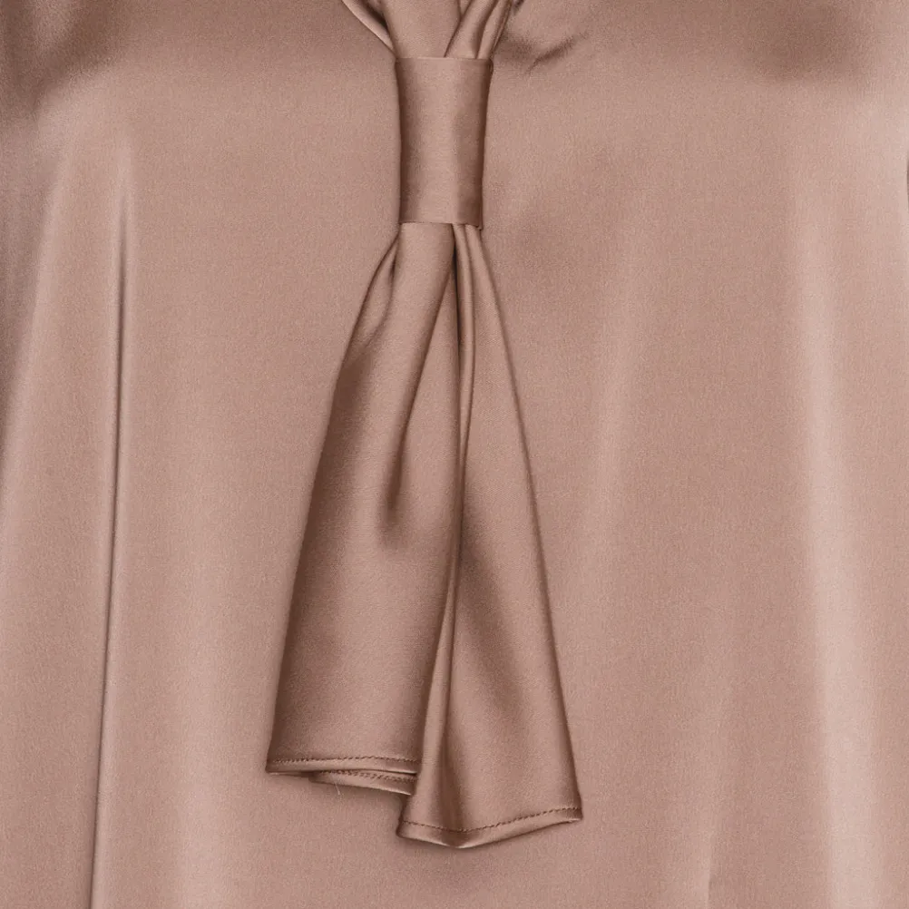 Smuk bluse fra Karmamia i semi rig satin med v-udskæring, sløjfedetaljer og lange ærmer, som kan styles på mange måder. Perfekt både til hverdag og fest.