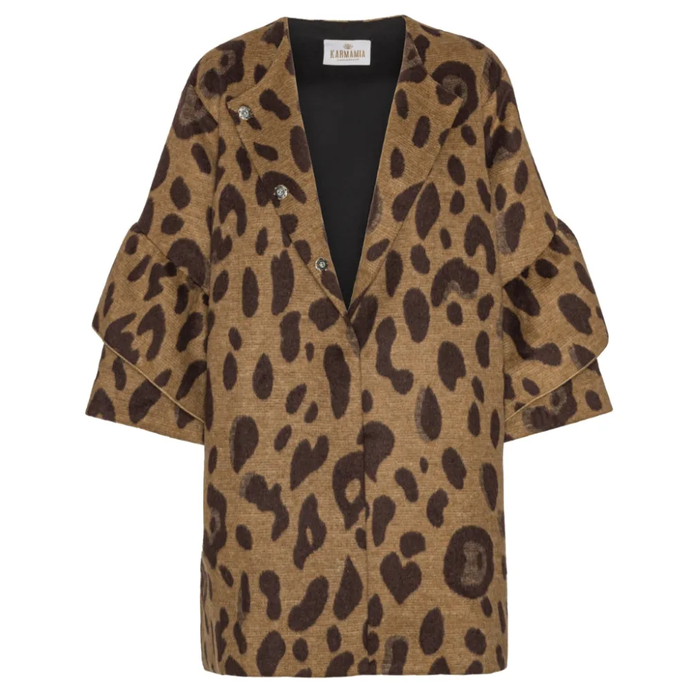 Super smuk og unik uldfrakke fra Karmamia med flotte detaljer. Jakken har flotte løse ærmer med flæseeffekt og smukt satinfoer med mønster. Limited edition.