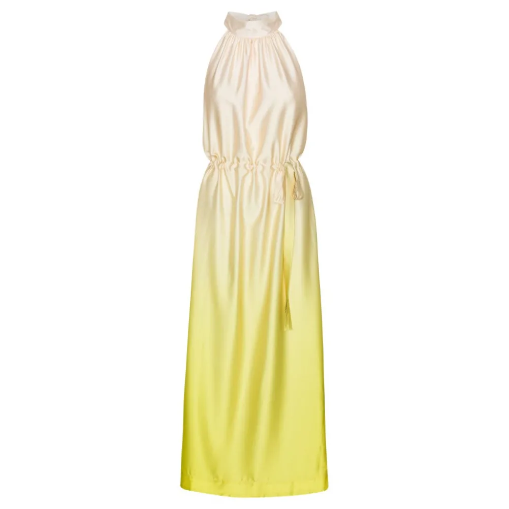 Super smuk satinkjole fra Karmamia med gradient farve og bindebånd i taljen. Med høj hals og elegante bånd i nakken. Perfekt til festlige begivenheder.
