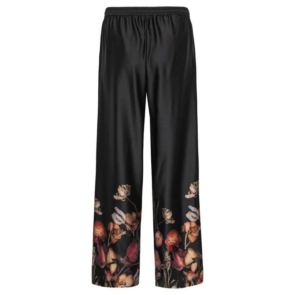 Smukke løse sorte satinbukser fra Karmamia med blomstermønster forneden og bindebånd i taljen og brede ben. Perfekte til både hverdag og fest.