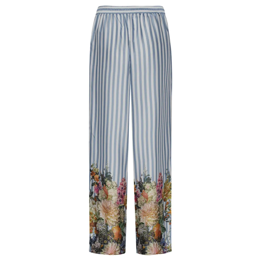 Smukke løse satinbukser fra Karmamia med striber og blomstermønster og bindebånd i taljen og brede ben. Perfekte til både hverdag og fest. Kan med fordel styles med den matchende skjorte.
