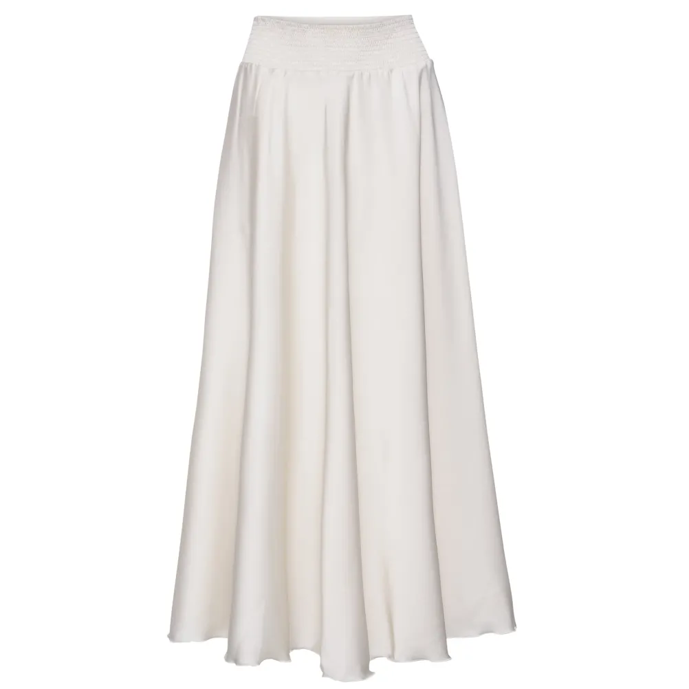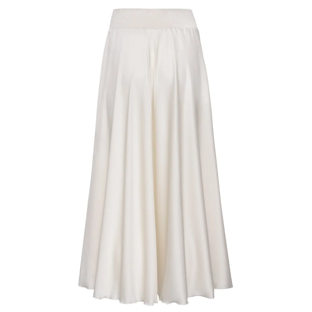 Super smuk lys cremefarvet satinnederdel fra Karmamia. Med elastik i taljen. Perfekt til både hverdag og fest.