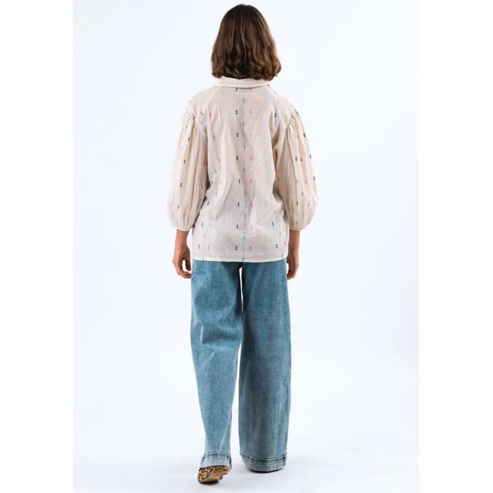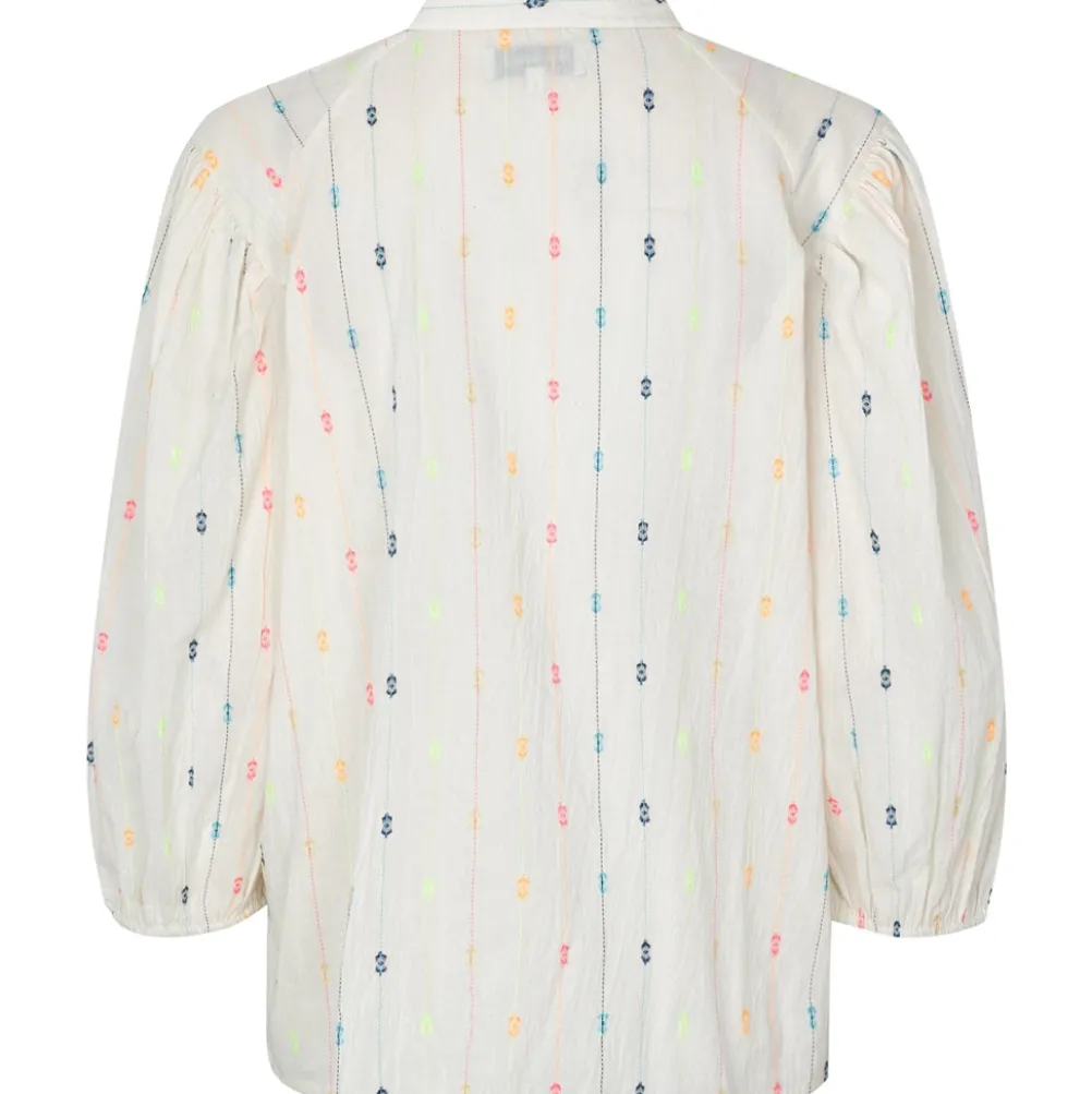 Super sød og elegant skjorte fra Lollys Laundry med små broderinger i forskellige farver og farvede små knapper. Med trekvartlange ærmer og klassisk krave.
