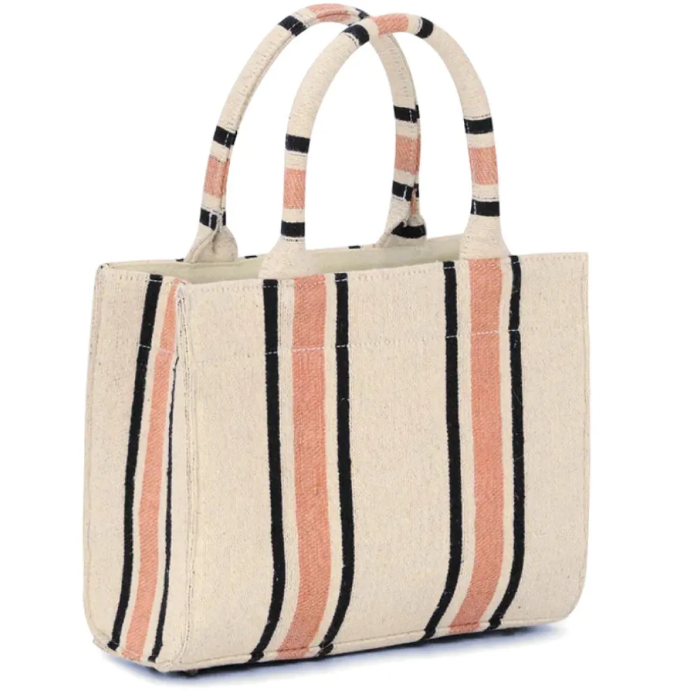 Flot mindre taske med fine striber fra Luna Moon lavet i bæredygtige naturprodukter. Tasken har tre lommer, hvor den ene lukkes med lynlås. Perfekt som strandtaske eller shopper.