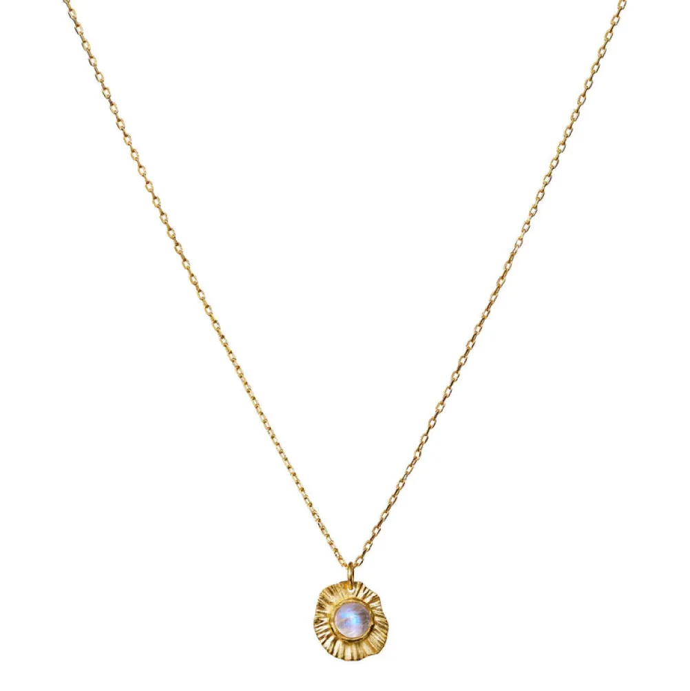 Materiale: Genanvendt sterlingsølv (925) belagt med 18 karat guld og regnbuefarvet månesten.