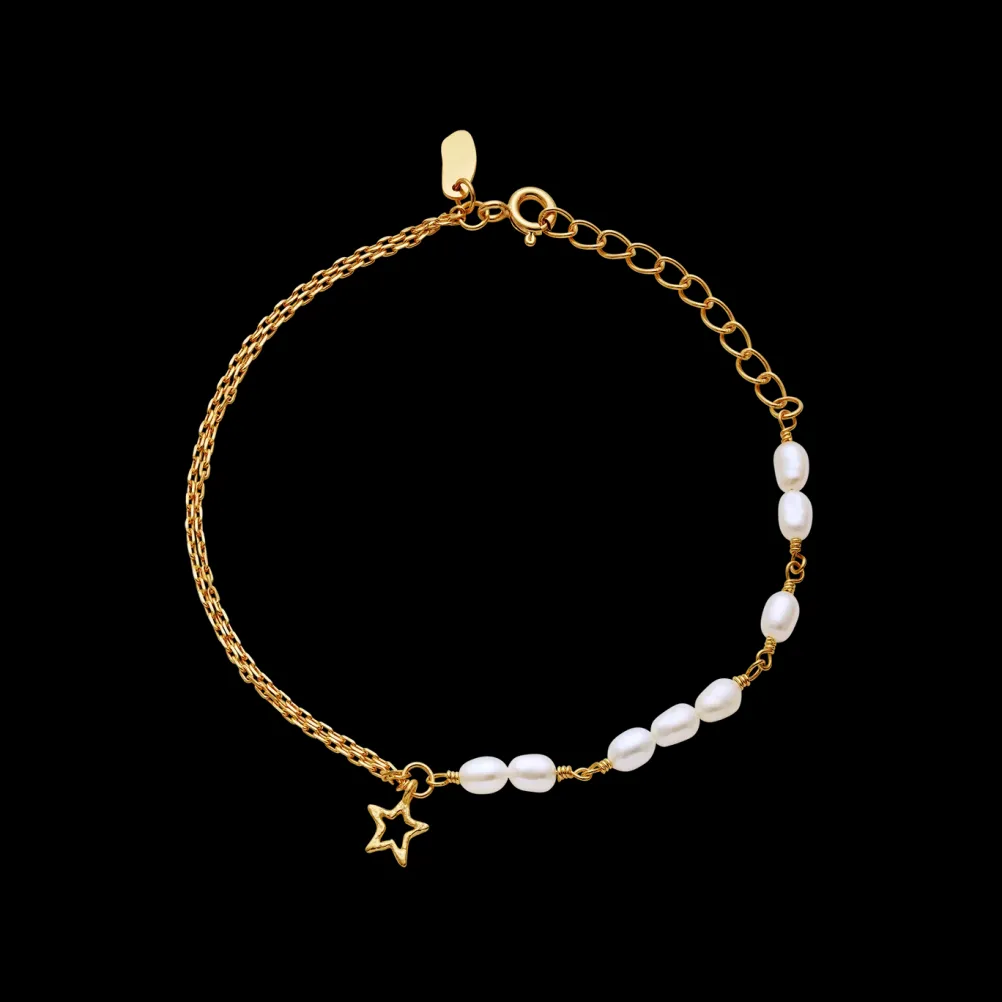 Smukt armbånd med fine små hvide ferskvandsperler og stjernevedhæng fra Maanesten.