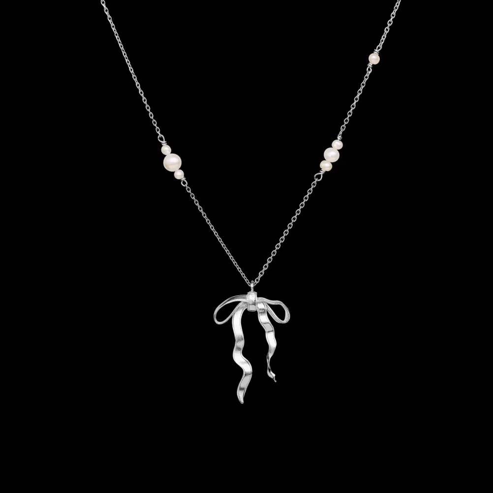 Smuk halskæde med sløjfevedhæng og små ferksvandsperler fra Maanesten. Fås både i guld og sølv.