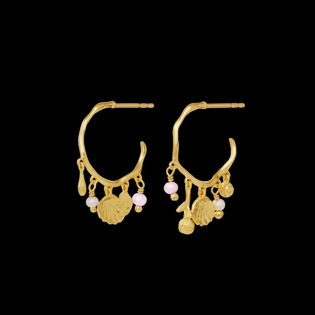 Smukke rustikke øreringe med vedhæng og små perler fra Maanesten. Fås både i guld og sølv.