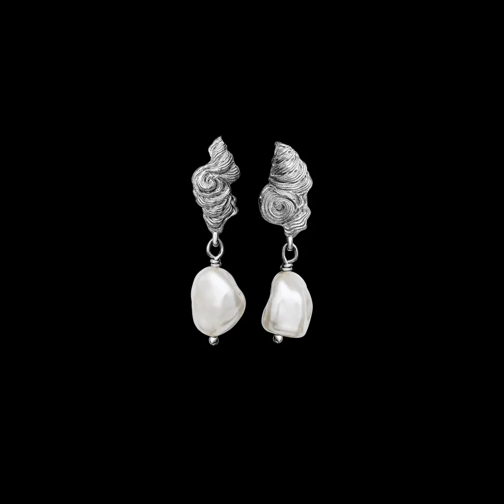 Flotte forgyldte øreringe fra Maanesten med fine snoede konkylier med en stor hvid ferskvandsperle som vedhæng.